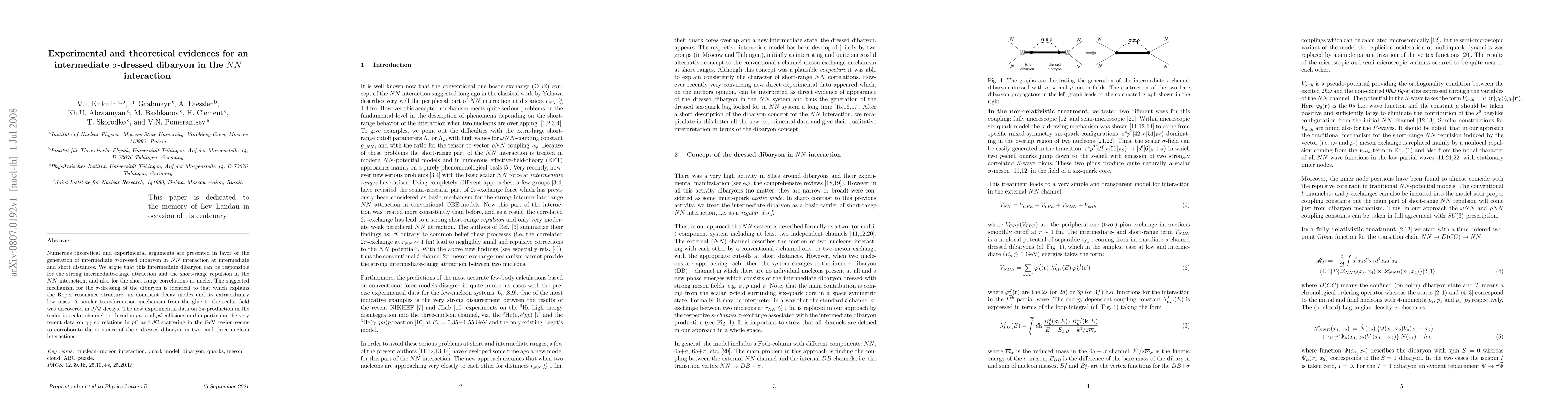 Numerous theoretical and experimental arguments are presented in favor of the generation of intermediate $\sigma$-dressed dibaryon in $NN$ interaction at intermediate and short distances. We argue that this intermediate dibaryon can be responsible for the strong intermediate-range attraction and the short-range repulsion in the $NN$ interaction, and also for the short-range correlations in nuclei. The suggested mechanism for the $\sigma$-dressing of the dibaryon is identical to that which explains the Roper resonance structure, its dominant decay modes and its extraordinary low mass. A similar transformation mechanism from the glue to the scalar field was discovered in $J/\Psi$ decays. The new experimental data on 2$\pi$-production in the scalar-isoscalar channel produced in $pn$- and $pd$-collisions and in particular the very recent data on $\gamma\gamma$ correlations in $p$C and $d$C scattering in the GeV region seems to corroborate the existence of the $\sigma$-dressed dibaryon in two- and three nucleon interactions.