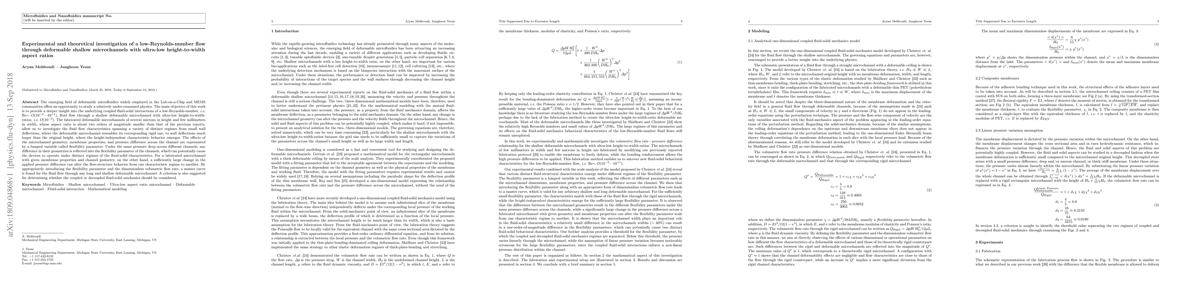 The emerging field of deformable microfluidics widely employed in the Lab-on-a-Chip and MEMS communities offers an opportunity to study a relatively under-examined physics. The main objective of this work is to provide a deeper insight into the underlying coupled fluid-solid interactions of a low-Reynolds-number fluid flow through a shallow deformable microchannel with ultra-low height-to-width ratios. The fabricated deformable microchannels of several microns in height and few millimeters in width, whose aspect ratio is about two orders of magnitude smaller than that of the previous reports, allow us to investigate the fluid flow characteristics spanning a variety of distinct regimes from small wall deflections, where the deformable microchannel resembles its corresponding rigid one, to wall deflections much larger than the original height, where the height-independent characteristic behavior emerges. The effects of the microchannel geometry, membrane properties, and pressure difference across the channel are represented by a lumped variable called flexibility parameter. Under the same pressure drop across different channels, any difference in their geometries is reflected into the flexibility parameter of the channels, which can potentially cause the devices to operate under distinct regimes of the fluid-solid characteristics. For a fabricated microchannel with given membrane properties and channel geometry, on the other hand, a sufficiently large change in the applied pressure difference can alter the flow-structure behavior from one characteristic regime to another. By appropriately introducing the flexibility parameter and the dimensionless volumetric flow rate, a master curve is found for the fluid flow through any long and shallow deformable microchannel. A criterion is also suggested for determining whether the coupled or decoupled fluid-solid mechanics should be considered.