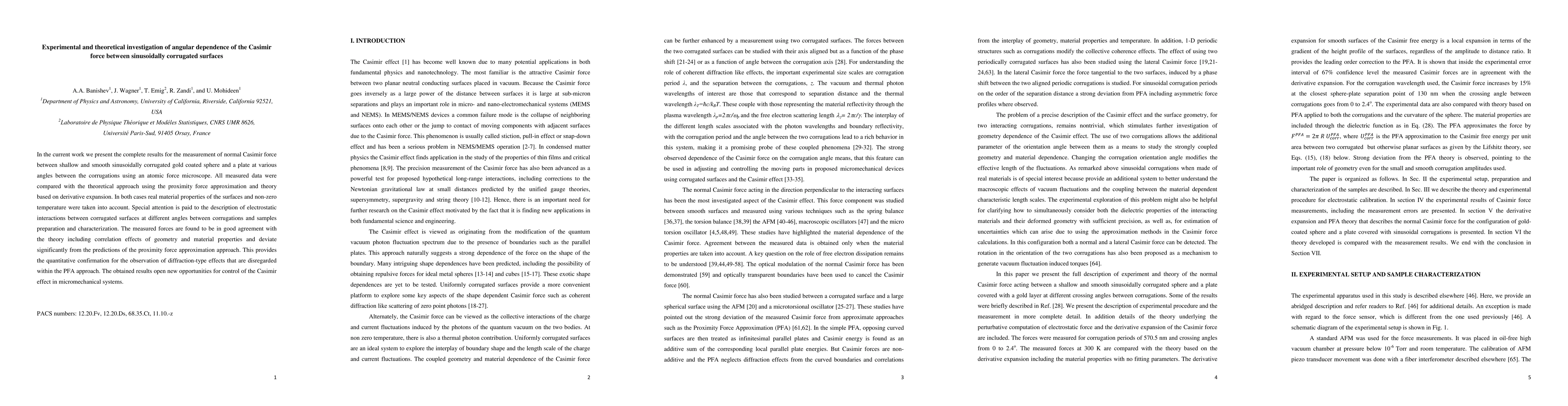 In the current work we present the complete results for the measurement of normal Casimir force between shallow and smooth sinusoidally corrugated gold coated sphere and a plate at various angles between the corrugations using an atomic force microscope. All measured data were compared with the theoretical approach using the proximity force approximation and theory based on derivative expansion. In both cases real material properties of the surfaces and non-zero temperature were taken into account. Special attention is paid to the description of electrostatic interactions between corrugated surfaces at different angels between corrugations and samples reparation and characterization. The measured forces are found to be in good agreement with the theory including correlation effects of geometry and material properties and deviate significantly from the predictions of the proximity force approximation approach. This provides the quantitative confirmation for the observation of diffraction-type effects that are disregarded within the PFA approach. The obtained results open new opportunities for control of the Casimir effect in micromechanical systems.