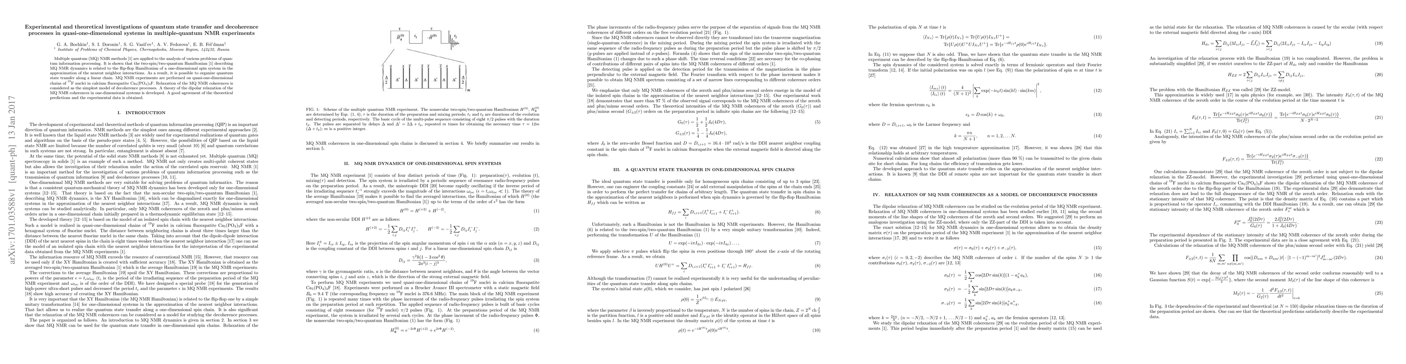 This paper investigates quantum state transfer and decoherence in quasi-one-dimensional systems using multiple quantum NMR experiments. It demonstrates the relationship between the two-spin Hamiltonian in MQ NMR and the flip-flop Hamiltonian of a one-dimensional spin system, enabling quantum state transfer along a linear chain, and validates the developed theory of dipolar relaxation with experimental data.
