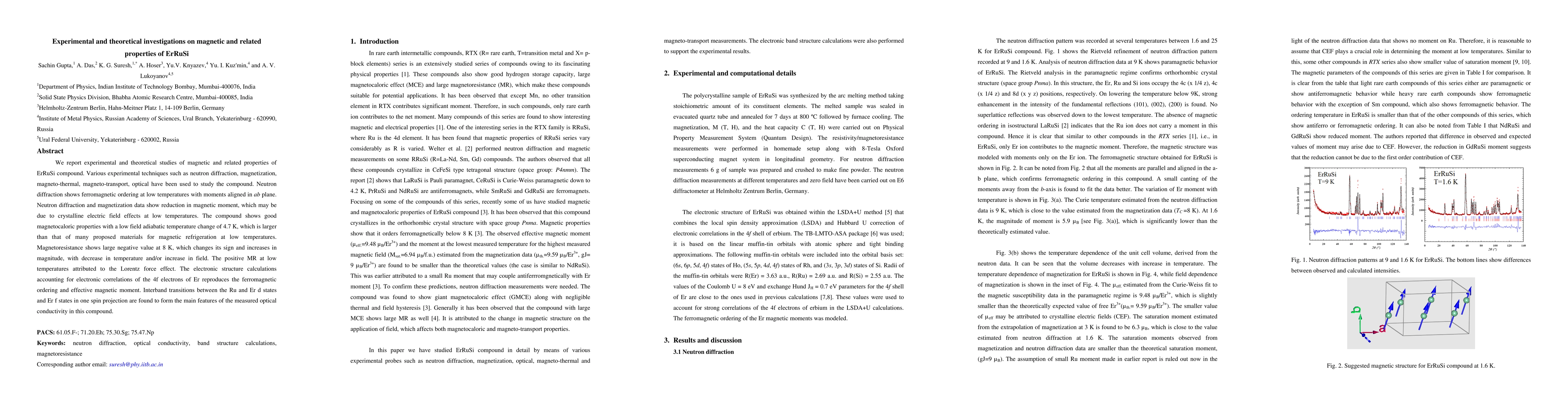 We report experimental and theoretical studies of magnetic and related properties of ErRuSi compound. Various experimental techniques such as neutron diffraction, magnetization, magneto-thermal, magneto-transport, optical have been used to study the compound. Neutron diffraction shows ferromagnetic ordering at low temperatures with moments aligned in ab plane. Neutron diffraction and magnetization data show reduction in magnetic moment, which may be due to crystalline electric field effects at low temperatures. The compound shows good magnetocaloric properties with a low field adiabatic temperature change of 4.7 K, which is larger than that of many proposed materials for magnetic refrigeration at low temperatures. Magnetoresistance shows large negative value at 8 K, which changes its sign and increases in magnitude, with decrease in temperature and/or increase in field. The positive MR at low temperatures attributed to the Lorentz force effect. The electronic structure calculations accounting for electronic correlations of the 4f electrons of Er reproduces the ferromagnetic ordering and effective magnetic moment. Interband transitions between the Ru and Er d states and Er f states in one spin projection are found to form the main features of the measured optical conductivity in this compound.