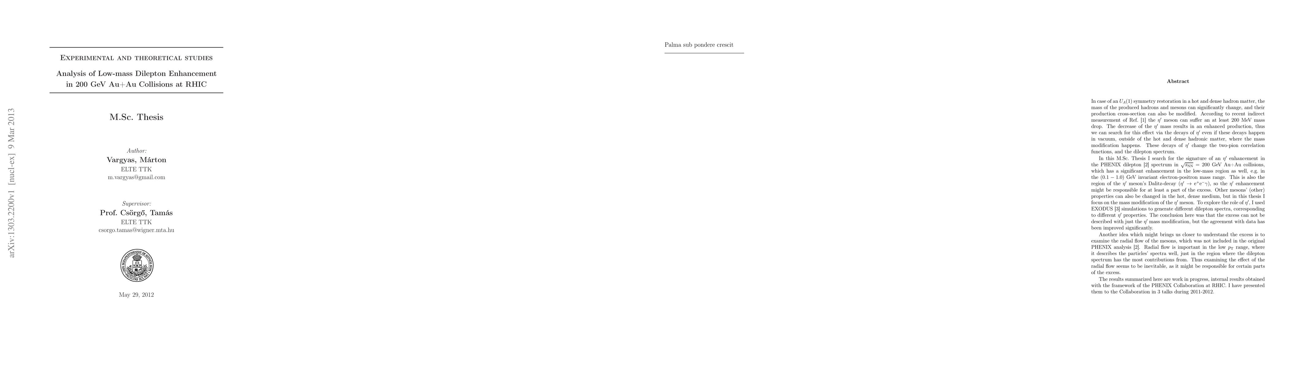 In case of an UA(1) symmetry restoration in a hot and dense hadronic matter, the mass of the produced hadrons and mesons can significantly change, and their production cross-section can also be modified. In this M.Sc. Thesis I search for the signature of an eta' enhancement in the PHENIX dilepton spectrum in 200 GeV Au+Au collisions, which has a significant enhancement in the low-mass region, e.g. in the (0.1-1.0) GeV invariant electron-positron mass range. This is also the region of the eta' meson's Dalitz-decay (eta'->ee gamma), so the eta' enhancement might be responsible for at least a part of the excess. Other mesons' (other) properties can also be changed in the hot, dense medium, but in this thesis I focus on the mass modification of the eta' meson. To explore the role of eta', I used EXODUS simulations to generate different dilepton spectra, corresponding to different eta' properties. The conclusion here was that the excess can not be described with just the eta' mass modification, but the agreement with data has been improved significantly. Another idea which might brings us closer to understand the excess is to examine the radial flow of the mesons, which was not included in the original PHENIX analysis. Radial flow is important in the low-pT range, where it describes the particles' spectra well: just in the region where the dilepton spectrum has the most contributions from. Thus examining the effect of the radial flow seems to be inevitable, as it might be responsible for certain parts of the excess. The results summarized here are work in progress, obtained with the framework of the PHENIX Collaboration at RHIC.