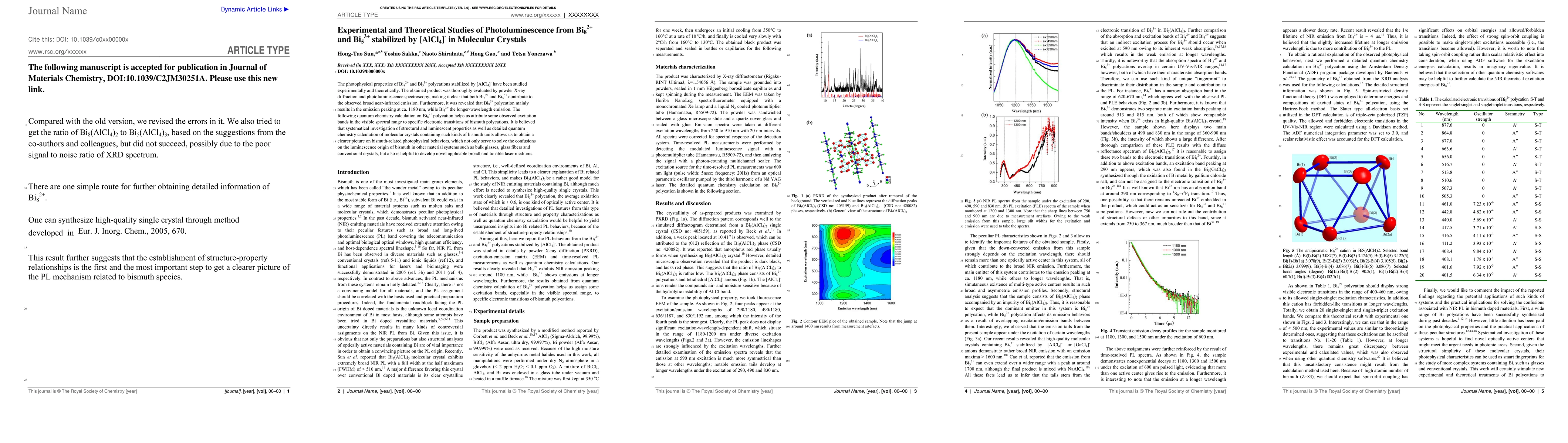 The photophysical properties of Bi82+ and Bi53+ polycations stabilized by [AlCl4]- have been studied experimentally and theoretically. The obtained product was thoroughly evaluated by powder X-ray diffraction and photoluminescence spectroscopy, making it clear that both Bi82+ and Bi53+ contribute to the observed broad near-infrared emission. Furthermore, it was revealed that Bi82+ polycation mainly results in the emission peaking at ca. 1180 nm, while Bi53+ the longer-wavelength emission. The following quantum chemistry calculation on Bi82+ polycation helps us attribute some observed excitation bands in the visible spectral range to specific electronic transitions of bismuth polycations. It is believed that systematical investigation of structural and luminescent properties as well as detailed quantum chemistry calculation of molecular crystals containing such kinds of bismuth units allows us to obtain a clearer picture on bismuth-related photophysical behaviors, which not only serve to solve the confusions on the luminescence origin of bismuth in other material systems such as bulk glasses, glass fibers and conventional crystals, but also is helpful to develop novel applicable broadband tunable laser mediums.