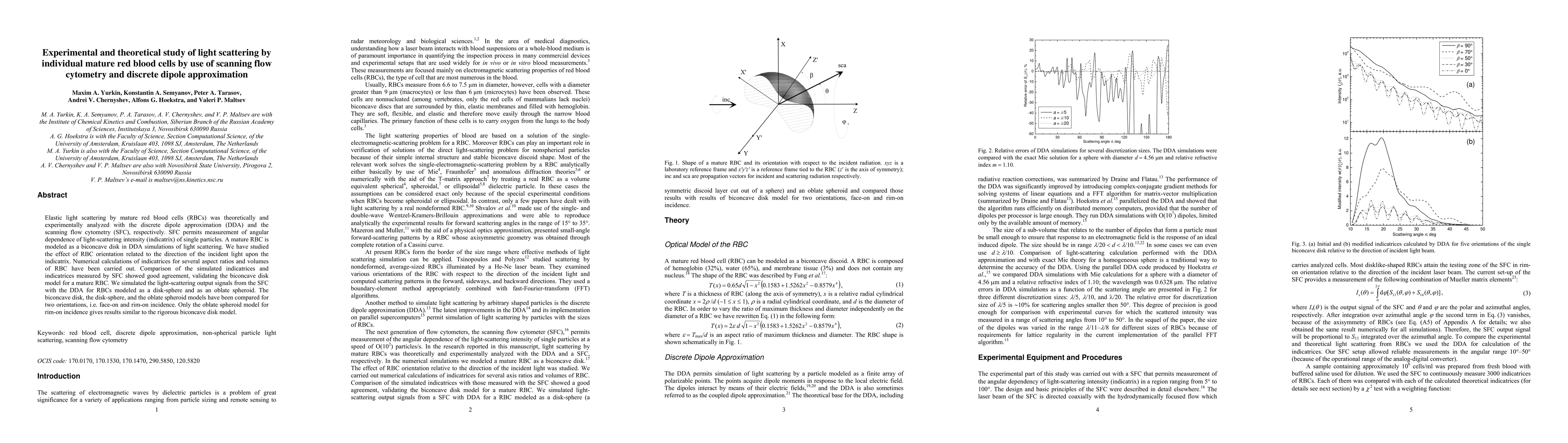 This study uses a combination of scanning flow cytometry and discrete dipole approximation to analyze light scattering by individual red blood cells, validating the biconcave disk model for mature RBCs.