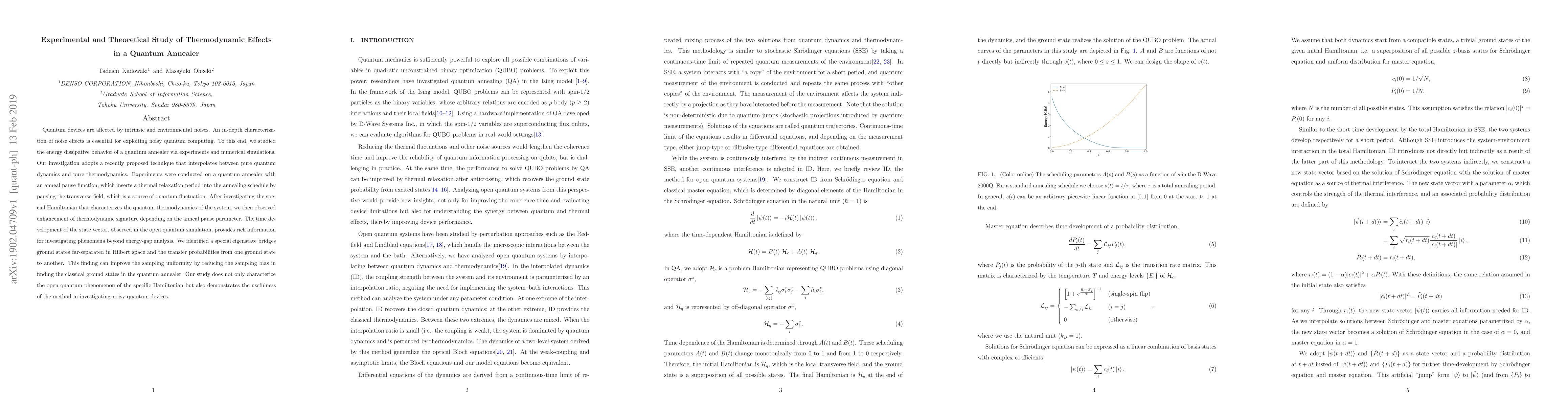 Quantum devices are affected by intrinsic and environmental noises. An in-depth characterization of noise effects is essential for exploiting noisy quantum computing. To this end, we studied the energy dissipative behavior of a quantum annealer via experiments and numerical simulations. Our investigation adopts a recently proposed technique that interpolates between pure quantum dynamics and pure thermodynamics. Experiments were conducted on a quantum annealer with an anneal pause function, which inserts a thermal relaxation period into the annealing schedule by pausing the transverse field, which is a source of quantum fluctuation. After investigating the special Hamiltonian that characterizes the quantum thermodynamics of the system, we then observed enhancement of thermodynamic signature depending on the anneal pause parameter. The time development of the state vector, observed in the open quantum simulation, provides rich information for investigating phenomena beyond energy-gap analysis. We identified a special eigenstate bridges ground states far-separated in Hilbert space and the transfer probabilities from one ground state to another. This finding can improve the sampling uniformity by reducing the sampling bias in finding the classical ground states in the quantum annealer. Our study does not only characterize the open quantum phenomenon of the specific Hamiltonian but also demonstrates the usefulness of the method in investigating noisy quantum devices.