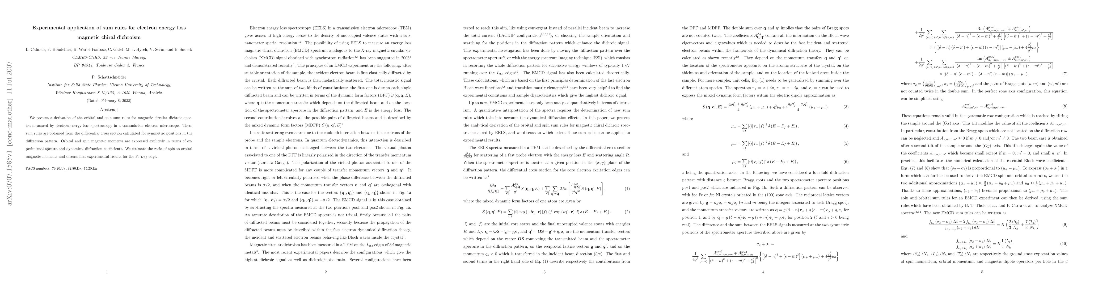 This paper derives orbital and spin sum rules for magnetic circular dichroism spectra measured via electron energy loss spectroscopy, providing explicit expressions for magnetic moments in terms of experimental data and discussing initial results for the Fe L_{2,3} edge.