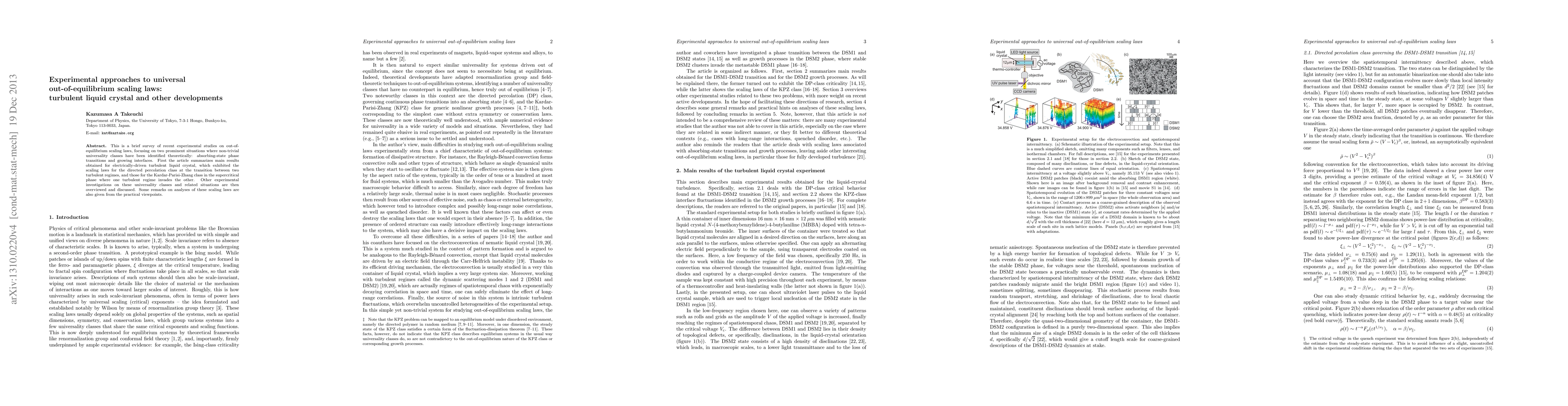 This is a brief survey of recent experimental studies on out-of-equilibrium scaling laws, focusing on two prominent situations where non-trivial universality classes have been identified theoretically: absorbing-state phase transitions and growing interfaces. First the article summarizes main results obtained for electrically-driven turbulent liquid crystal, which exhibited the scaling laws for the directed percolation class at the transition between two turbulent regimes, and those for the Kardar-Parisi-Zhang class in the supercritical phase where one turbulent regime invades the other. Other experimental investigations on these universality classes and related situations are then overviewed and discussed. Some remarks on analyses of these scaling laws are also given from the practical viewpoints.