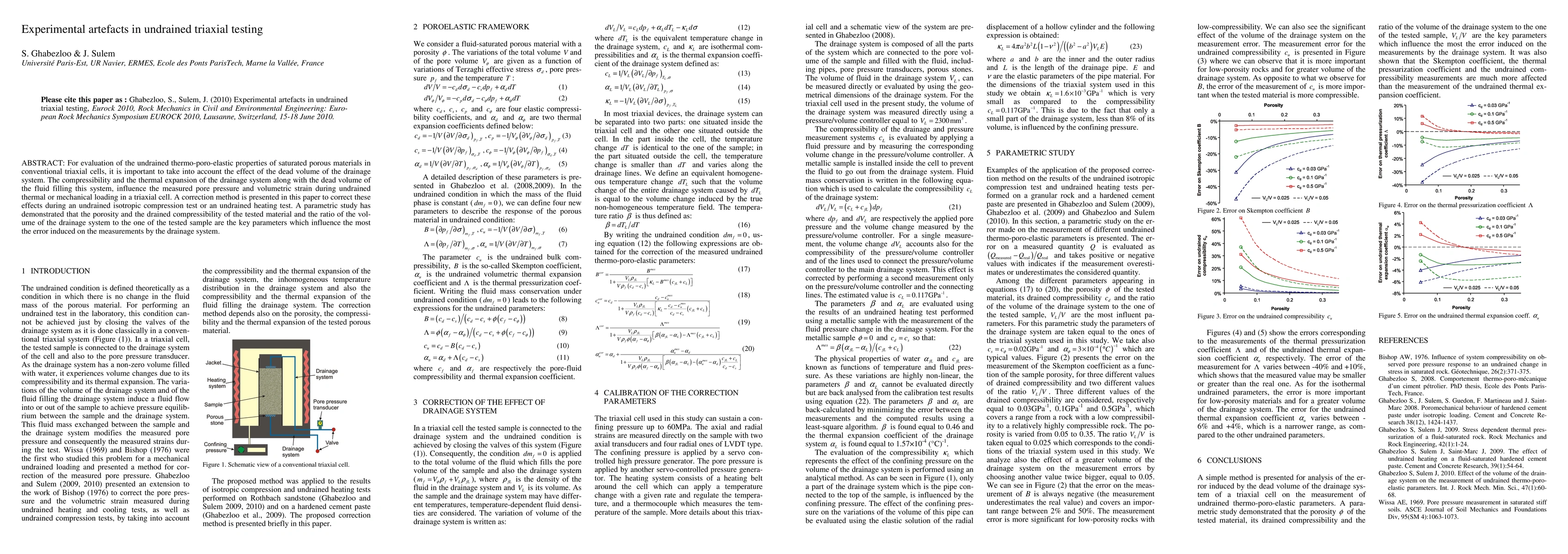 This paper presents a correction method to address experimental artefacts in undrained triaxial tests caused by the drainage system's dead volume, compressibility, and thermal expansion. The study highlights the impact of sample porosity, drained compressibility, and drainage system volume ratio on measurement errors.