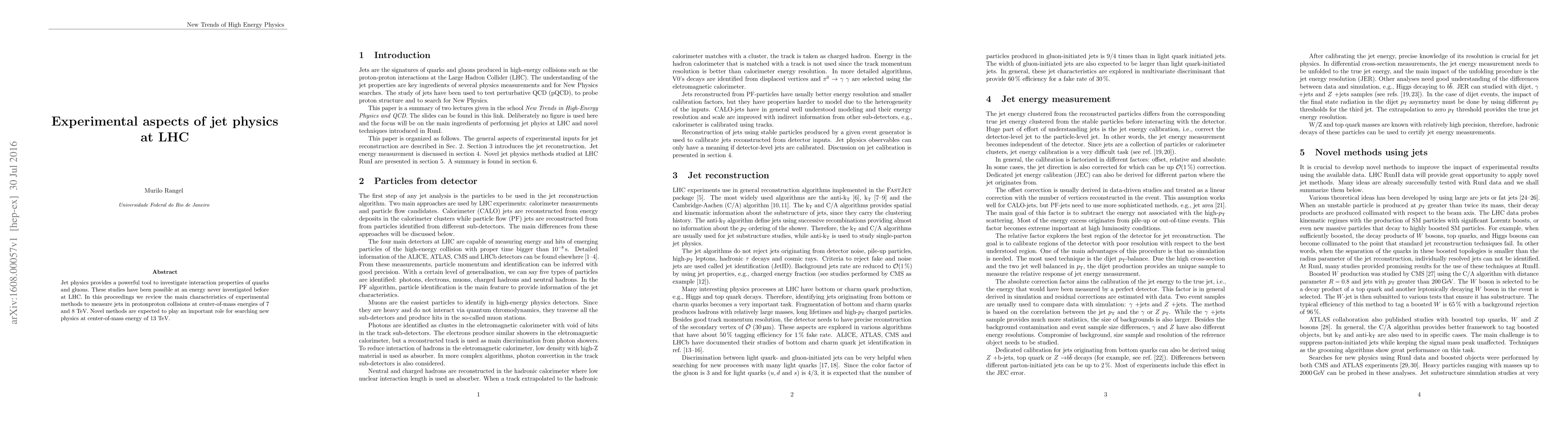 Jet physics provides a powerful tool to investigate interaction properties of quarks and gluons. These studies have been possible at an energy never investigated before at LHC. In this proceedings we review the main characteristics of experimental methods to measure jets in proton-proton collisions at center-of-mass energies of 7 and 8 TeV. Novel methods are expected to play an important role for searching new physics at center-of-mass energy of 13 TeV.