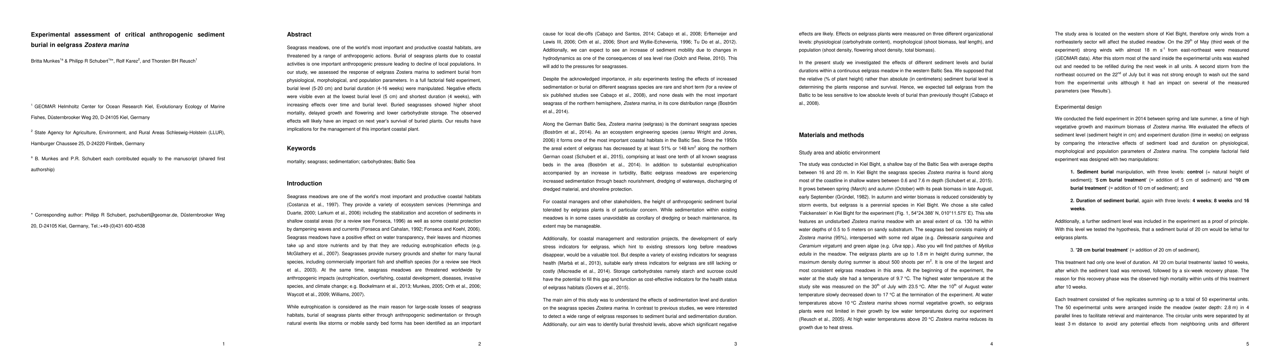 Seagrass meadows, one of the worlds most important and productive coastal habitats, are threatened by a range of anthropogenic actions. Burial of seagrass plants due to coastal activities is one important anthropogenic pressure leading to decline of local populations. In our study, we assessed the response of eelgrass Zostera marina to sediment burial from physiological, morphological, and population parameters. In a full factorial field experiment, burial level (5-20 cm) and burial duration (4-16 weeks) were manipulated. Negative effects were visible even at the lowest burial level (5 cm) and shortest duration (4 weeks), with increasing effects over time and burial level. Buried seagrasses showed higher shoot mortality, delayed growth and flowering and lower carbohydrate storage. The observed effects will likely have an impact on next years survival of buried plants. Our results have implications for the management of this important coastal plant.