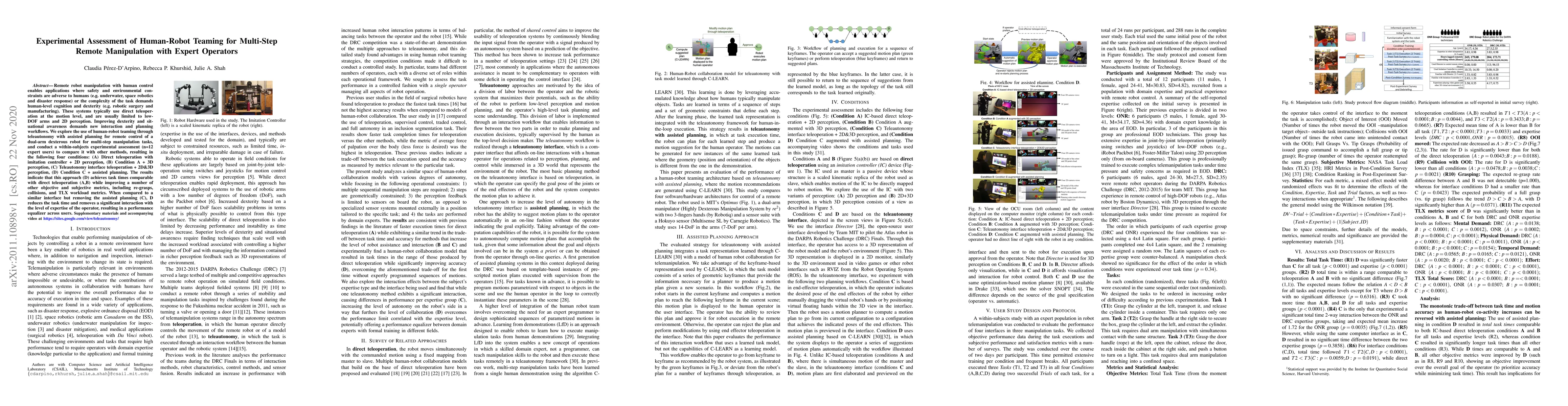 This study evaluates human-robot teaming through teleautonomy with assisted planning for remote control of a dual-arm robot in multi-step manipulation tasks. Experimental results show that the teleautonomy approach with assisted planning (D) significantly reduces task time and workload compared to direct teleoperation (A,B) and even teleautonomy without assisted planning (C), equalizing performance across expert users.