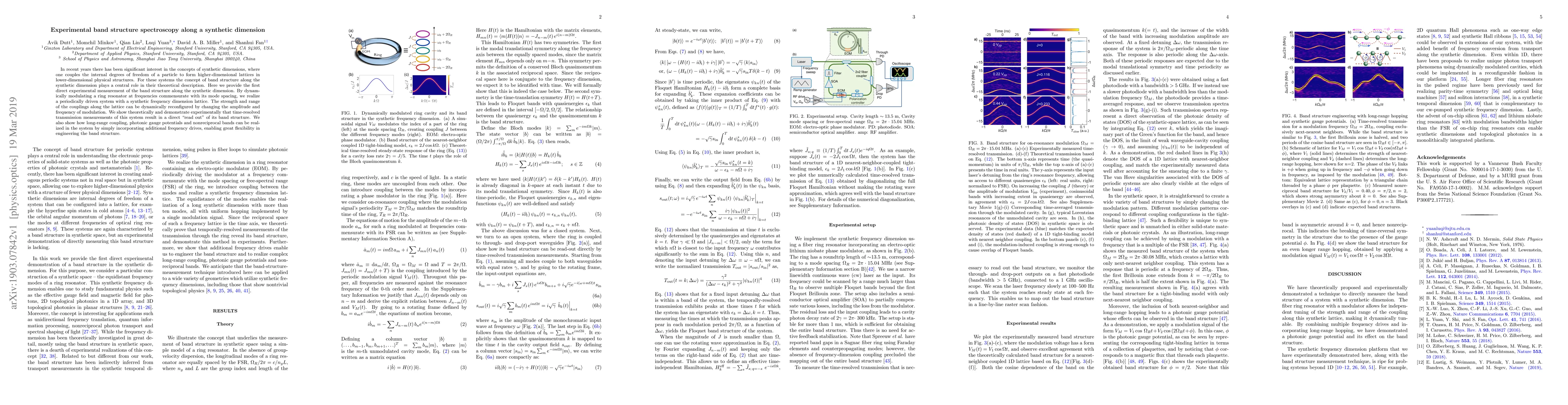 This paper reports the first direct experimental measurement of band structure along a synthetic dimension, achieved by modulating a ring resonator to create a synthetic frequency dimension lattice. The study demonstrates the flexibility in engineering the band structure through dynamic reconfiguration and the realization of long-range coupling and photonic gauge potentials.