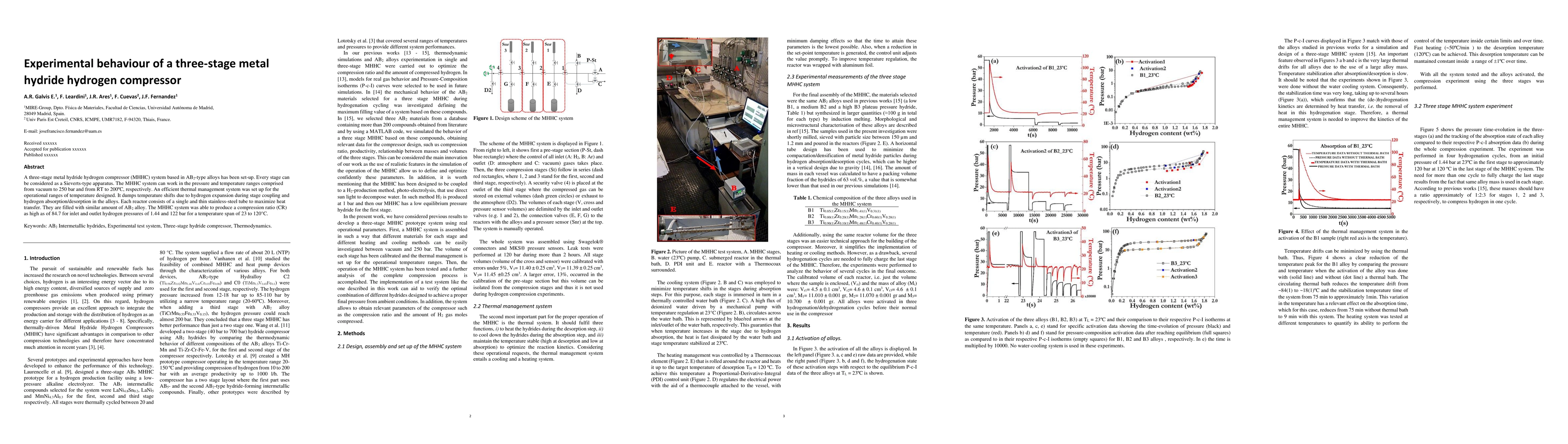 A three-stage metal hydride hydrogen compressor (MHHC) system based in AB2-type alloys has been set-up. Every stage can be considered as a Sieverts-type apparatus. The MHHC system can work in the pressure and temperature ranges comprised from vacuum to 250 bar and from RT to 200C, respectively. An efficient thermal management system was set up for the operational ranges of temperature designed. It dumps temperature shifts due to hydrogen expansion during stage coupling and hydrogen absorption/desorption in the alloys. Each reactor consists of a single and thin stainless-steel tube to maximize heat transfer. They are filled with similar amount of AB2 alloy. The MHHC system was able to produce a compression ratio (CR) as high as of 84.7 for inlet and outlet hydrogen pressures of 1.44 and 122 bar for a temperature span of 23 to 120C.