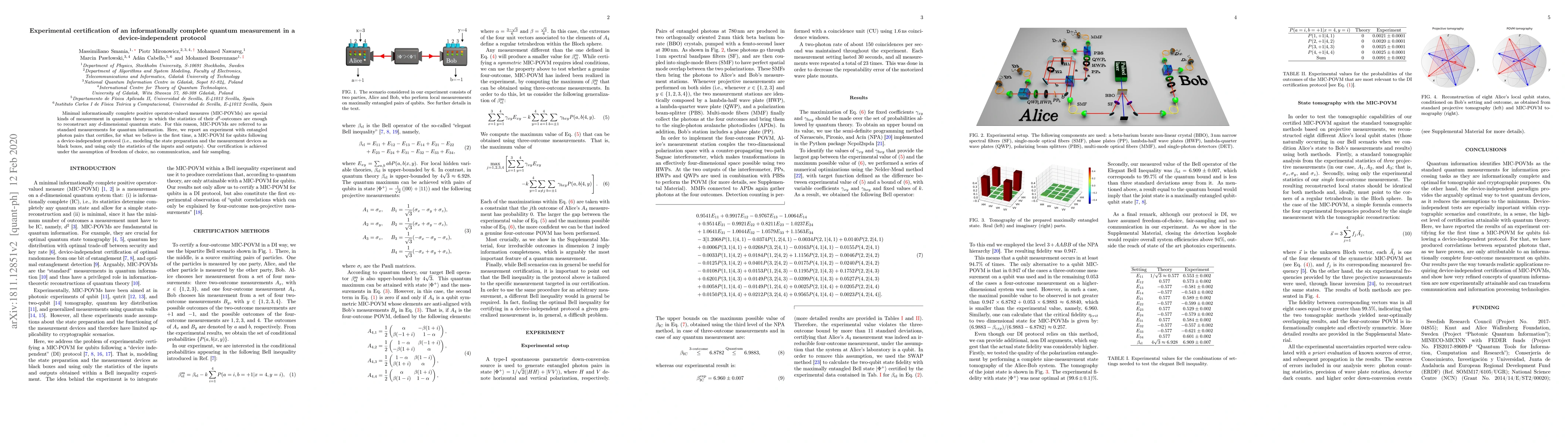This paper reports the first experimental certification of a minimal informationally complete quantum measurement (MIC-POVM) for qubits using entangled photon pairs in a device-independent protocol, ensuring the measurement's outcomes can reconstruct any qubit state. The experiment operates under assumptions of freedom of choice, no communication, and fair sampling.
