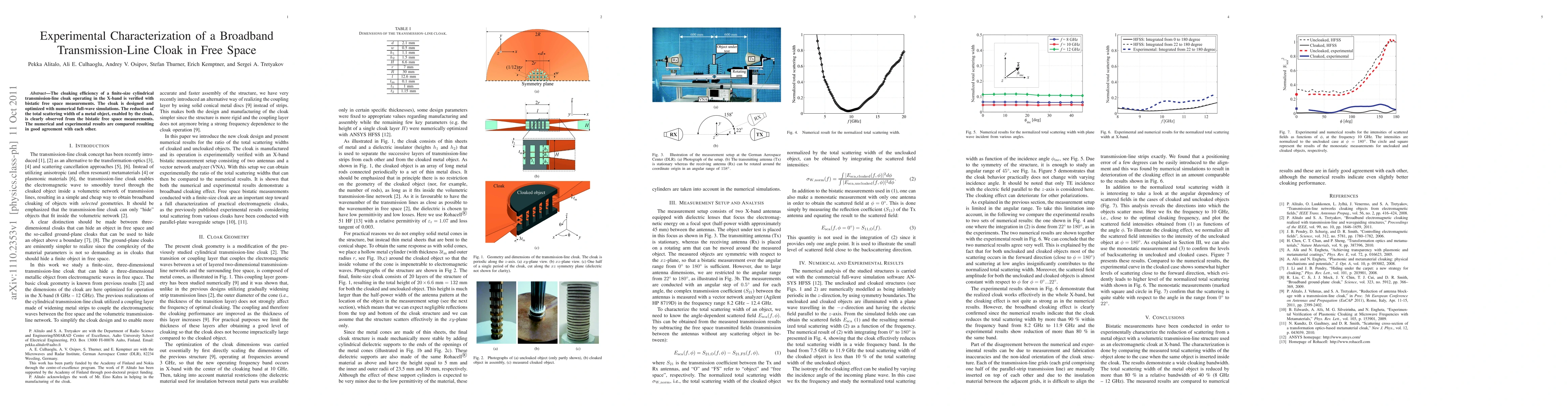 This paper experimentally verifies the cloaking efficiency of a broadband transmission-line cloak in free space using bistatic measurements, and demonstrates the reduction in scattering of a metal object, with numerical simulations corroborating the experimental findings.
