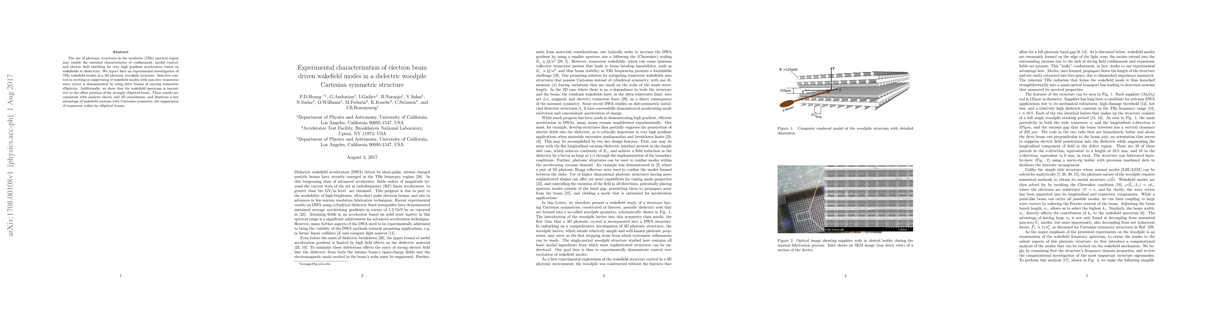 This paper experimentally investigates THz wakefield modes in a 3D photonic woodpile structure, demonstrating selective control over wakefield modes using elliptical drive beams. The study shows that the wakefield spectrum remains unaffected by beam offset position, consistent with theoretical predictions and simulations, highlighting the benefits of Cartesian symmetry in suppressing transverse wakes.