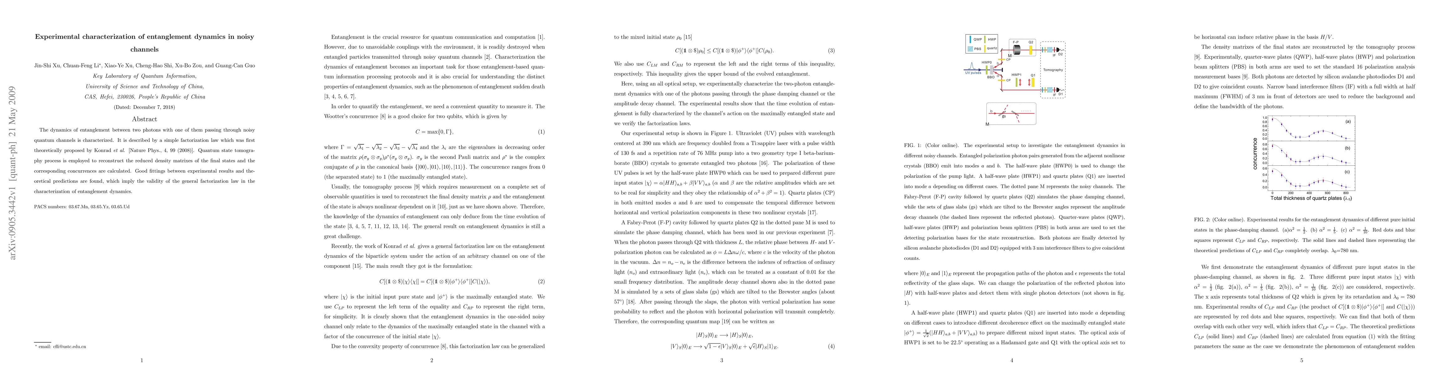Researchers studied how entanglement between photons changes when one photon passes through a noisy quantum channel. They found good agreement between experimental results and theoretical predictions, validating the factorization law for characterizing entanglement dynamics.