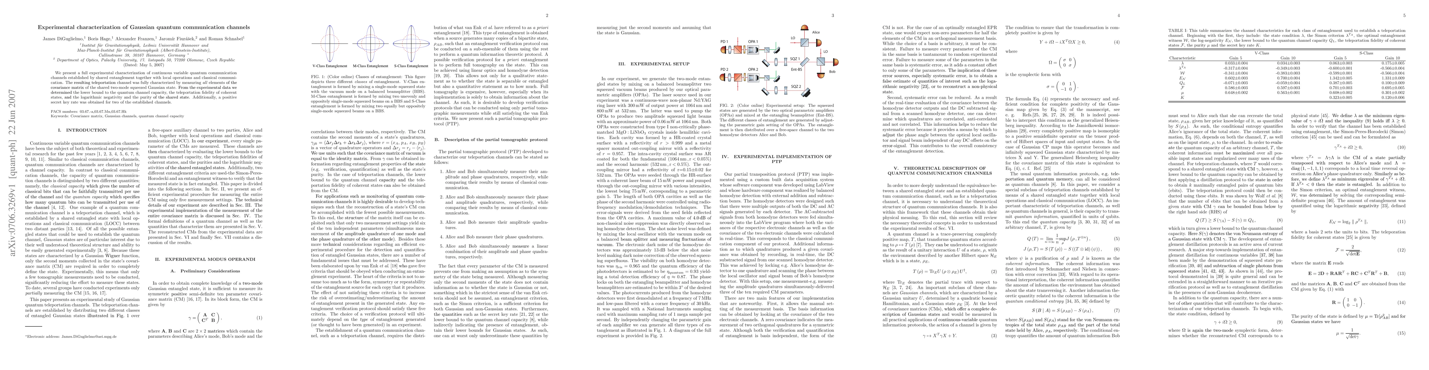 This paper experimentally characterizes Gaussian quantum communication channels using shared entanglement and local operations, determining the quantum channel capacity, teleportation fidelity, and purity, and achieving a positive secret key rate for two channels.