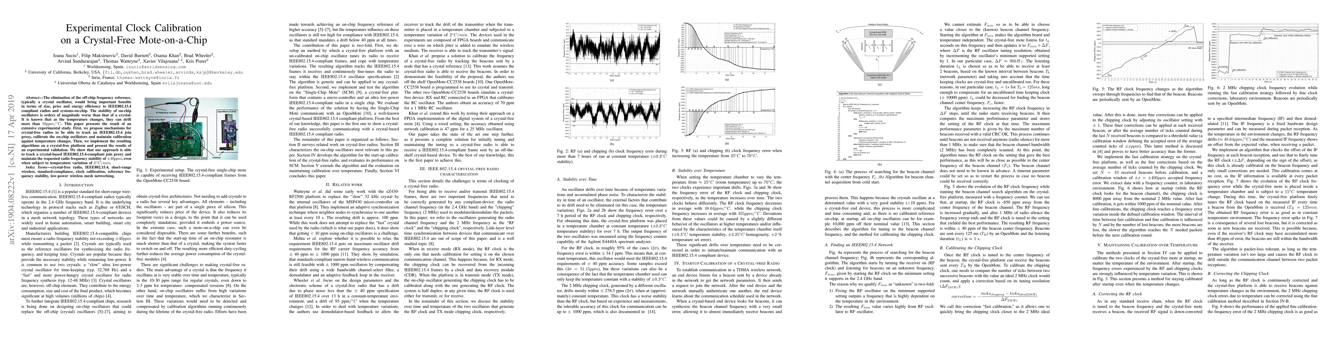 The elimination of the off-chip frequency reference, typically a crystal oscillator, would bring important benefits in terms of size, price and energy efficiency to IEEE802.15.4 compliant radios and systems-on-chip. The stability of on-chip oscillators is orders of magnitude worse than that of a crystal. It is known that as the temperature changes, they can drift more than 50 ppm/{\deg}C. This paper presents the result of an extensive experimental study. First, we propose mechanisms for crystal-free radios to be able to track an IEEE802.15.4 join proxy, calibrate the on-chip oscillators and maintain calibration against temperature changes. Then, we implement the resulting algorithms on a crystal-free platform and present the results of an experimental validation. We show that our approach is able to track a crystal-based IEEE802.15.4-compliant join proxy and maintain the requested radio frequency stability of +/-40 ppm, even when subject to temperature variation of 2{\deg}C/min.