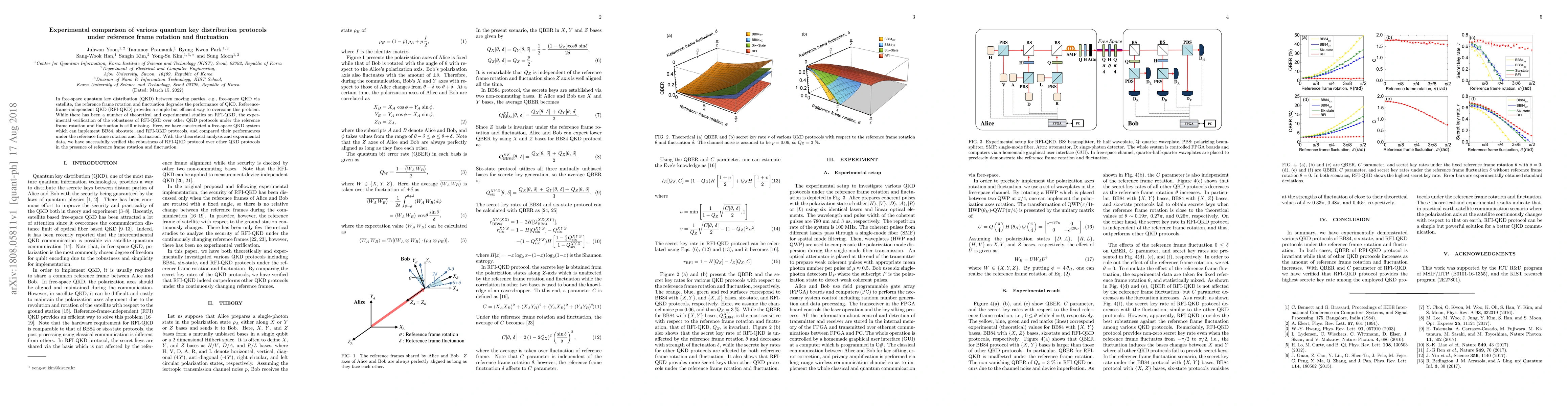 This paper experimentally compares the performance of BB84, six-state, and reference-frame-independent QKD protocols under conditions of reference frame rotation and fluctuation. The results confirm the robustness of RFI-QKD in overcoming these challenges compared to other protocols.