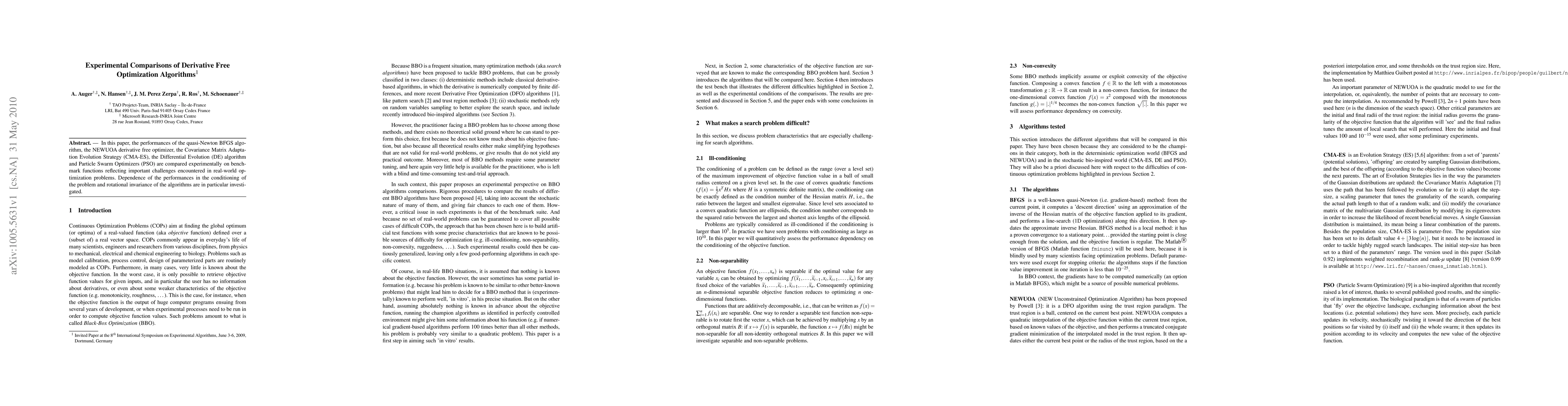 A study compares six optimization algorithms on various benchmark functions to assess their performance and identify factors affecting results, focusing on problem conditioning and rotational invariance.