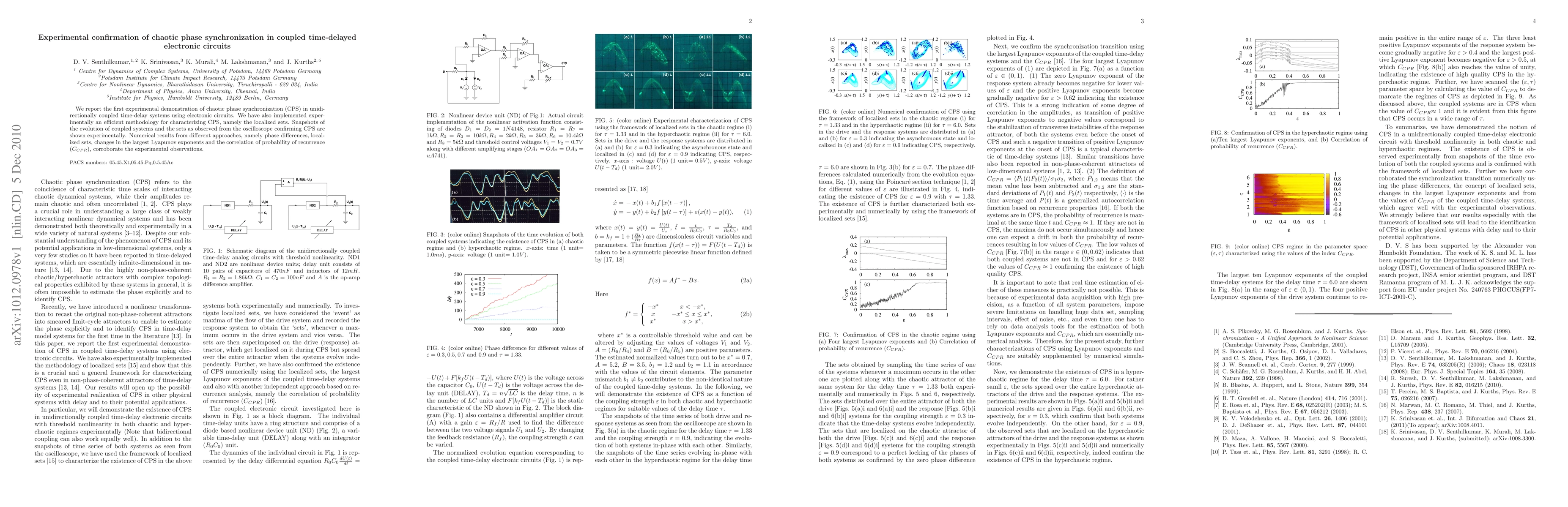 This paper experimentally confirms chaotic phase synchronization (CPS) in coupled time-delayed electronic circuits and introduces an efficient methodology for characterizing CPS using localized sets. Experimental and numerical results corroborate the observed CPS.
