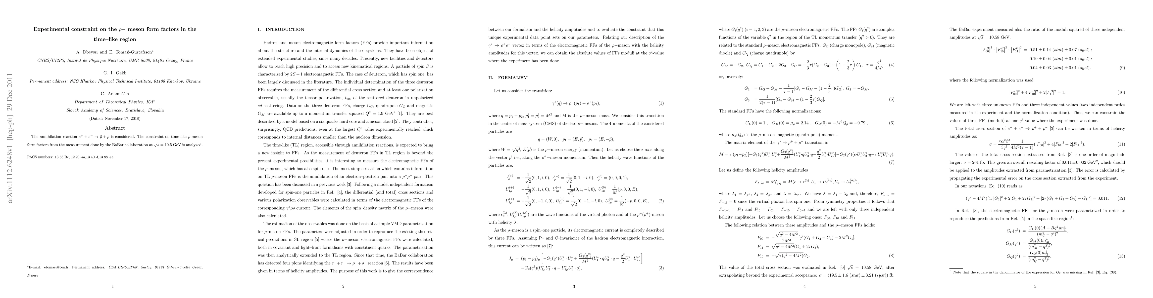 The annihilation reaction $e^++e^-\rightarrow \bar \rho+\rho $ is considered. The constraint on time-like $\rho$-meson form factors from the measurement done by the BaBar collaboration at $\sqrt{s}=10.5$ GeV is analyzed.