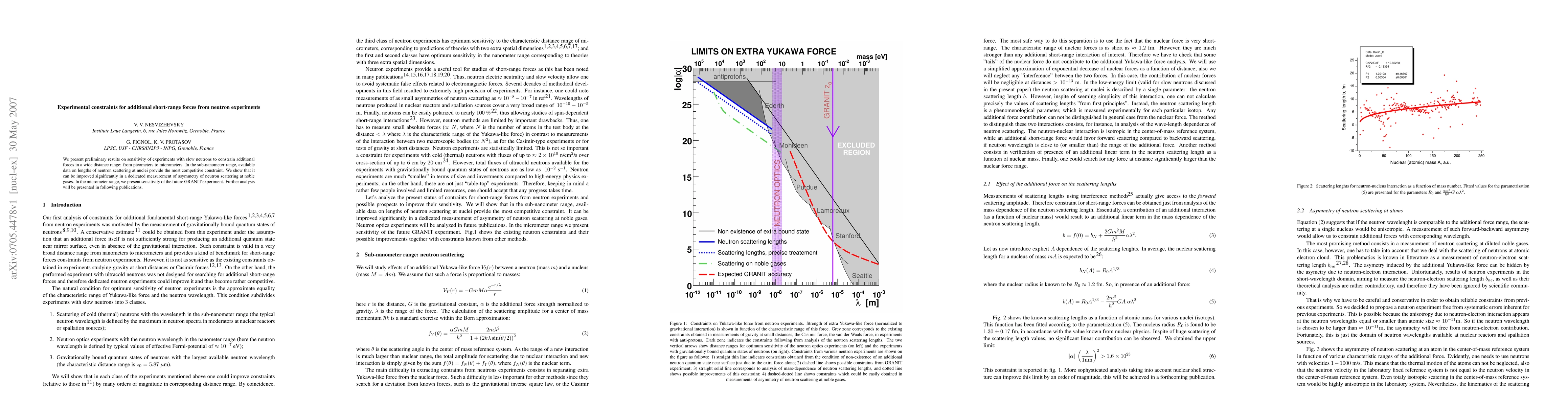 We present preliminary results on sensitivity of experiments with slow neutrons to constrain additional forces in a wide distance range: from picometers to micrometers. In the sub-nanometer range, available data on lengths of neutron scattering at nuclei provide the most competitive constraint. We show that it can be improved significantly in a dedicated measurement of asymmetry of neutron scattering at noble gases. In the micrometer range, we present sensitivity of the future GRANIT experiment. Further analysis will be presented in following publications.