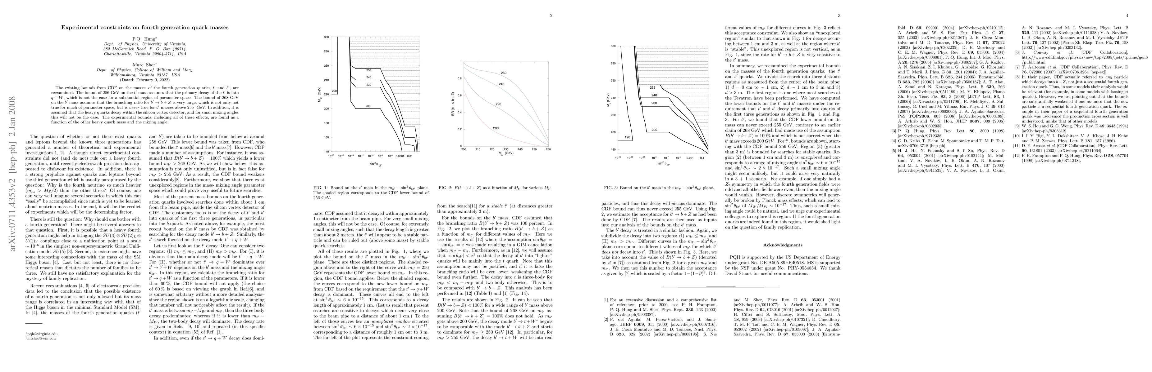 This paper reexamines experimental constraints on fourth generation quark masses, t' and b', revealing that existing CDF bounds are overly restrictive due to incorrect assumptions about decay channels and mixing angles. Updated bounds are provided considering all relevant decay parameters and mixing scenarios.