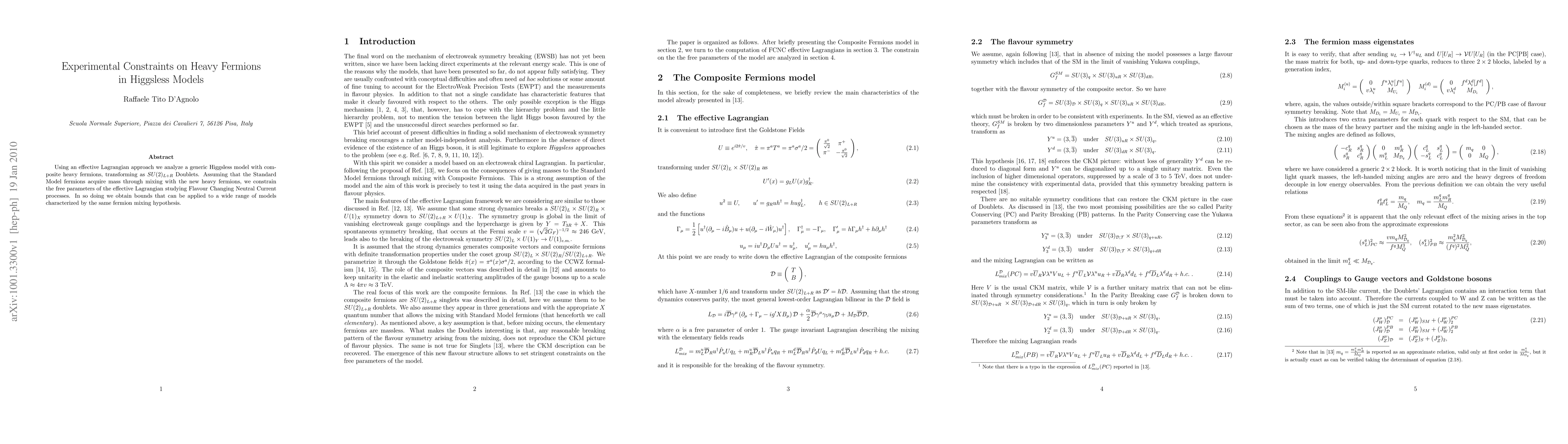Using an effective Lagrangian approach we analyze a generic Higgsless model with composite heavy fermions, transforming as SU(2)_{L+R} Doublets. Assuming that the Standard Model fermions acquire mass through mixing with the new heavy fermions, we constrain the free parameters of the effective Lagrangian studying Flavour Changing Neutral Current processes. In so doing we obtain bounds that can be applied to a wide range of models characterized by the same fermion mixing hypothesis.