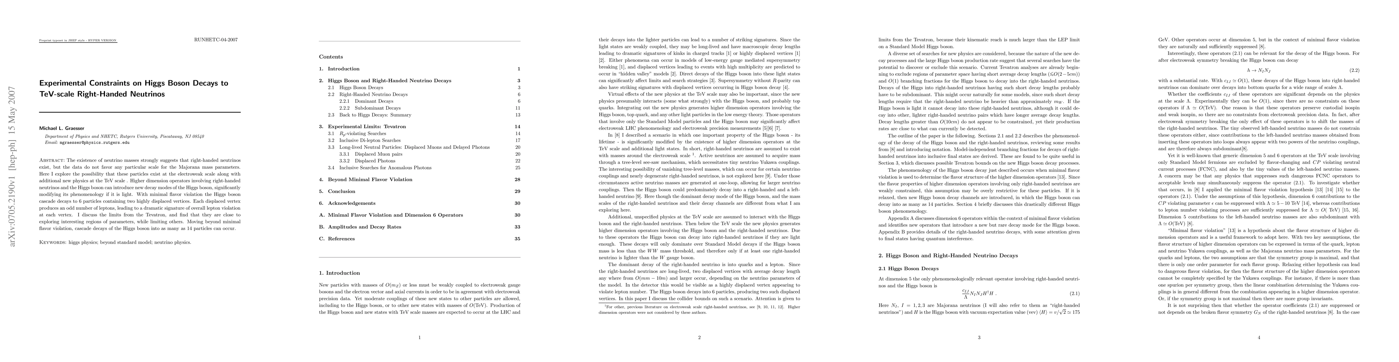 The existence of neutrino masses strongly suggests that right-handed neutrinos exist, but the data do not favor any particular scale for the Majorana mass parameters. Here I explore the possibility that these particles exist at the electroweak scale along with additional new physics at the TeV scale . Higher dimension operators involving right-handed neutrinos and the Higgs boson can introduce new decay modes of the Higgs boson, significantly modifying its phenomenology if it is light. With minimal flavor violation the Higgs boson cascade decays to 6 particles containing two highly displaced vertices. Each displaced vertex produces an odd number of leptons, leading to a dramatic signature of overall lepton violation at each vertex. I discuss the limits from the Tevatron, and find that they are close to exploring interesting regions of parameters, while limiting others. Moving beyond minimal flavor violation, cascade decays of the Higgs boson into as many as 14 particles can occur.