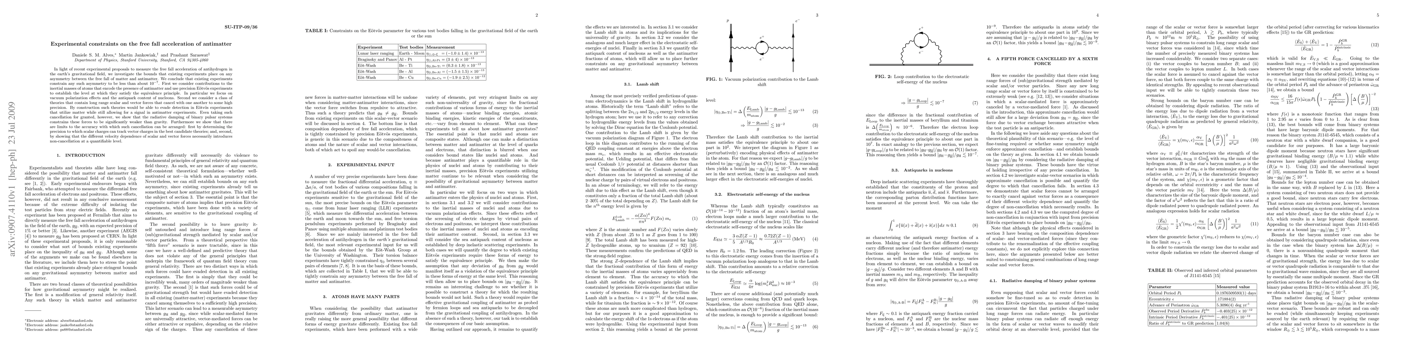 This paper investigates experimental constraints on any asymmetry in the free fall acceleration of antimatter compared to matter, concluding that existing experiments limit such asymmetry to less than 10^-7. It also examines theories with long-range forces that could potentially differentiate matter and antimatter, showing that these forces are constrained by the radiative damping of binary pulsar systems.