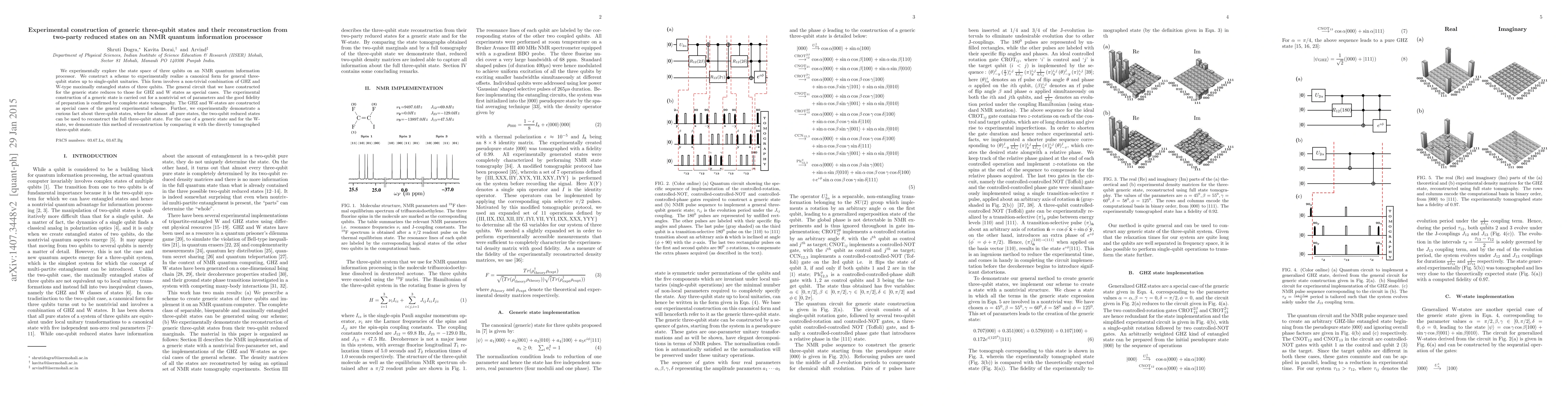 This paper details an experimental setup on an NMR quantum processor to construct generic three-qubit states using a combination of GHZ and W states, and demonstrates the reconstruction of these states from their two-qubit reduced states with high fidelity. The experimental scheme confirms the successful preparation of these states through complete state tomography.