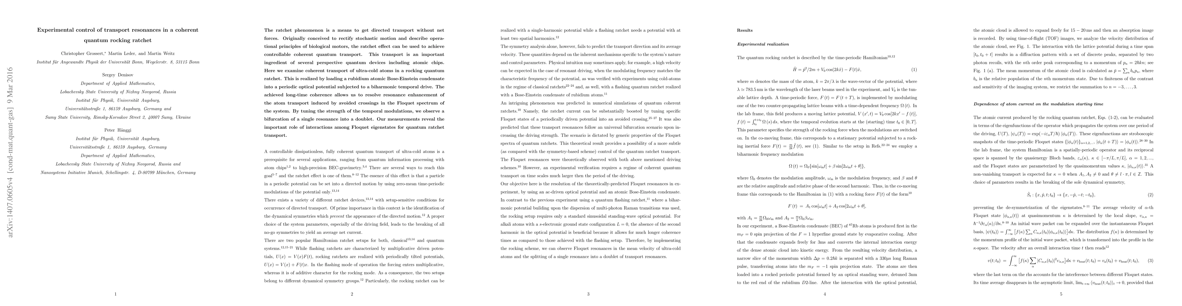 This paper investigates coherent quantum transport in a rocking ratchet using ultra-cold atoms, demonstrating resonance enhancement through avoided crossings in the Floquet spectrum. By modulating the temporal drive, the researchers observe a bifurcation of a single resonance into a doublet, highlighting the influence of interactions among Floquet eigenstates on quantum ratchet transport.