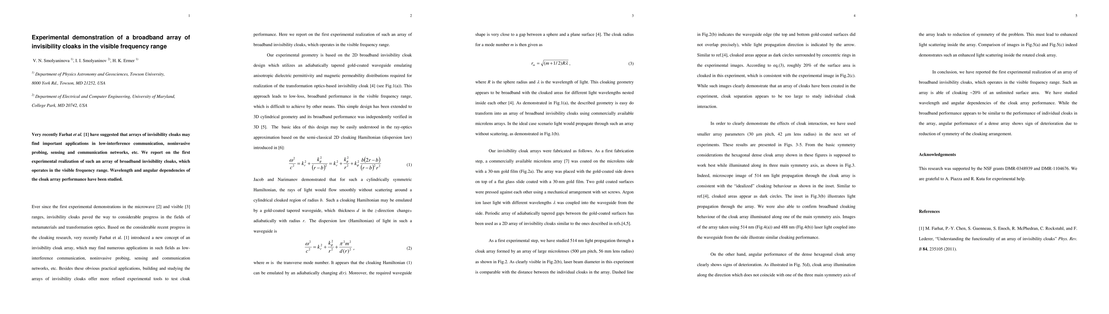 This paper reports the first experimental realization of a broadband array of invisibility cloaks operating in the visible frequency range, demonstrating potential applications in communication and sensing. The study investigates the wavelength and angular performance of the cloak array.
