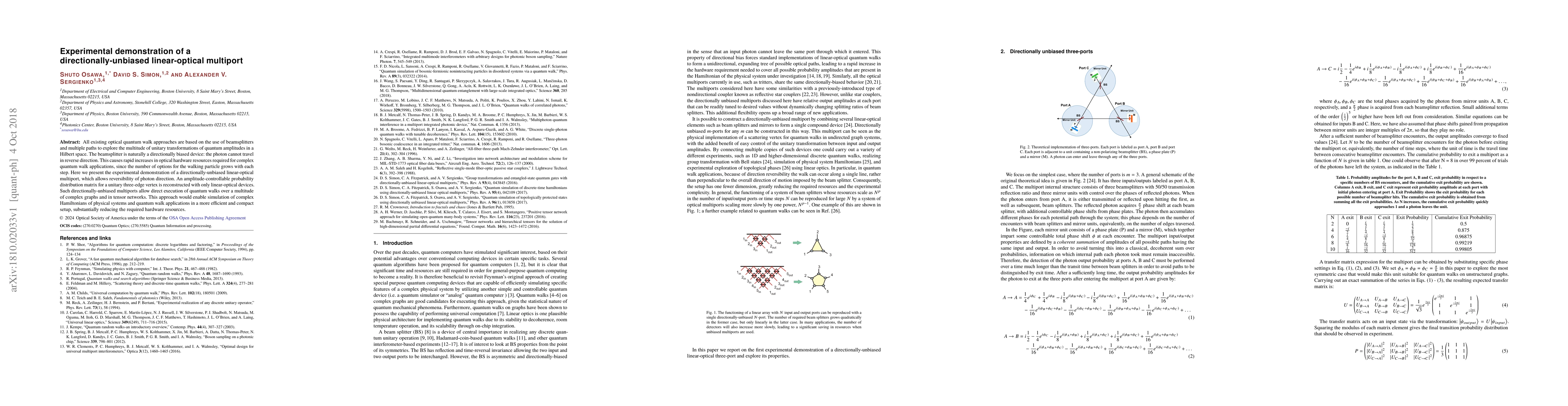 This paper demonstrates a directionally-unbiased linear-optical multiport, enabling reversible photon travel and reducing hardware resources for quantum walk applications. The experiment reconstructs an amplitude-controllable probability matrix using only linear optical devices, facilitating efficient quantum walk simulations.