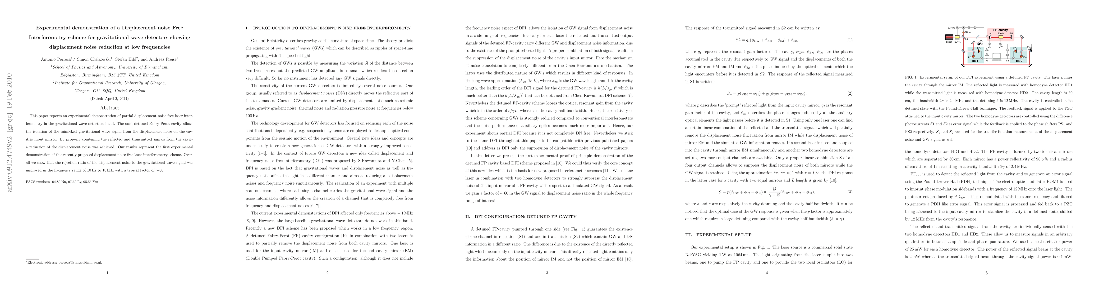 This paper demonstrates a displacement noise free laser interferometry scheme for gravitational wave detection, achieving significant noise reduction at low frequencies. The detuned Fabry-Perot cavity isolates the gravitational wave signal, improving the rejection ratio by a factor of 60 in the 10 Hz to 10 kHz range.