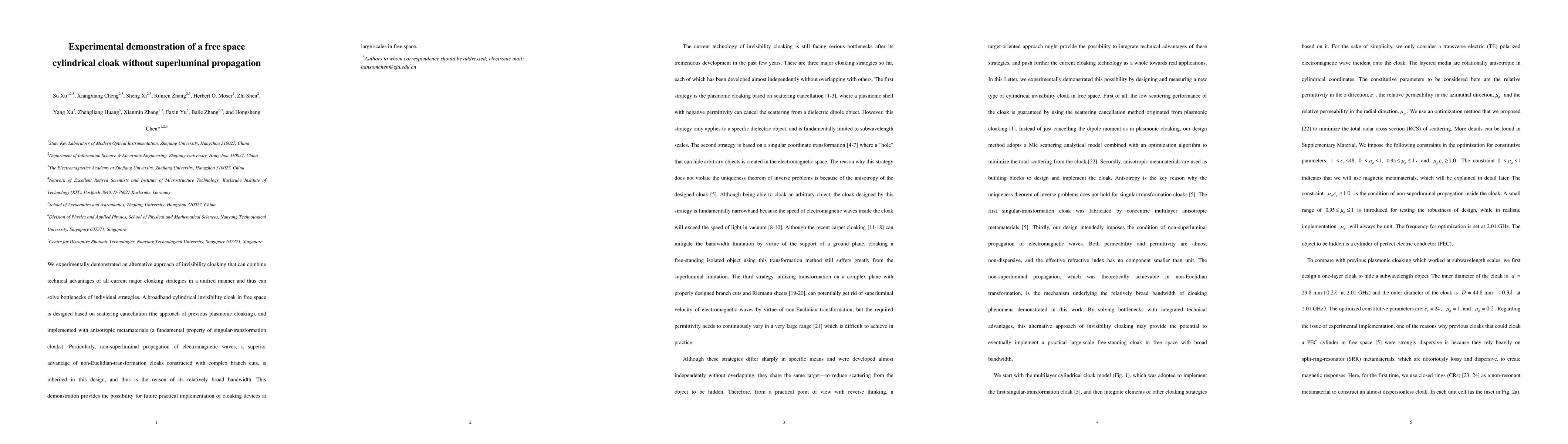 This paper demonstrates a free space cylindrical cloak using scattering cancellation and anisotropic metamaterials, combining the advantages of various cloaking strategies without requiring superluminal wave propagation. This approach offers a broad bandwidth and paves the way for practical large-scale cloaking devices.