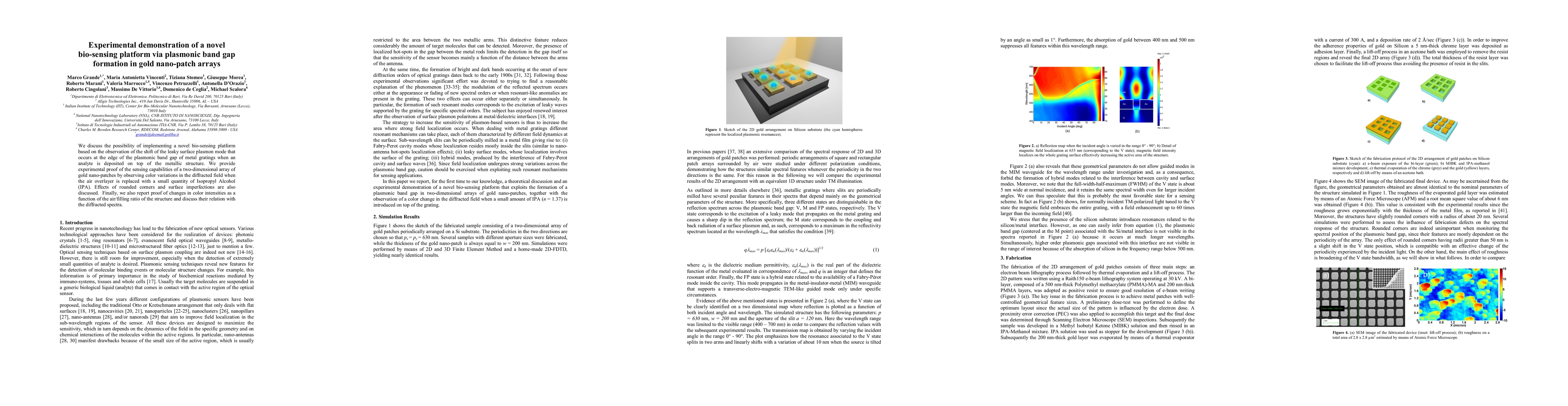 This paper demonstrates a novel bio-sensing platform using gold nano-patch arrays that detect shifts in the leaky surface plasmon mode due to the plasmonic band gap formation. Experimental results show color variations upon replacing air with Isopropyl Alcohol, confirming the platform's sensing capabilities.