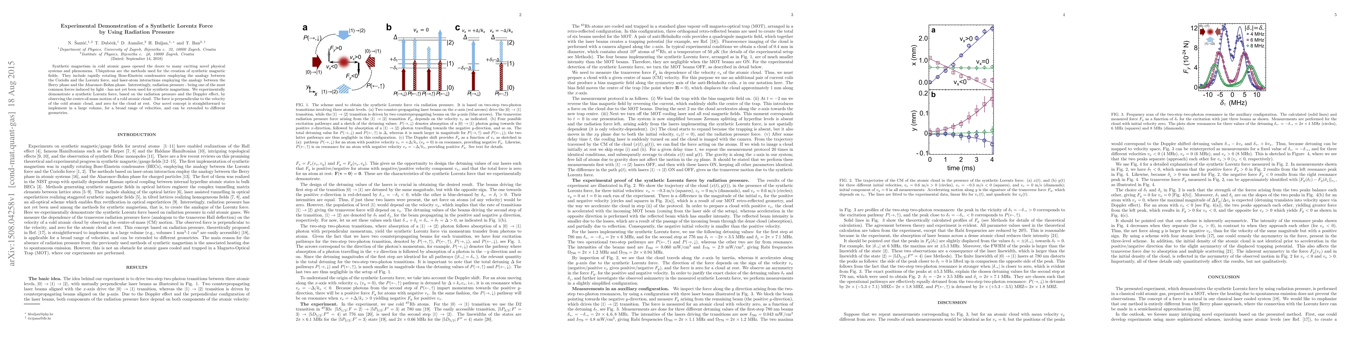 This paper demonstrates a synthetic Lorentz force using radiation pressure and the Doppler effect, observing the center-of-mass motion of a cold atomic cloud. This novel approach, straightforward to implement over large volumes, provides a new method for synthetic magnetism.