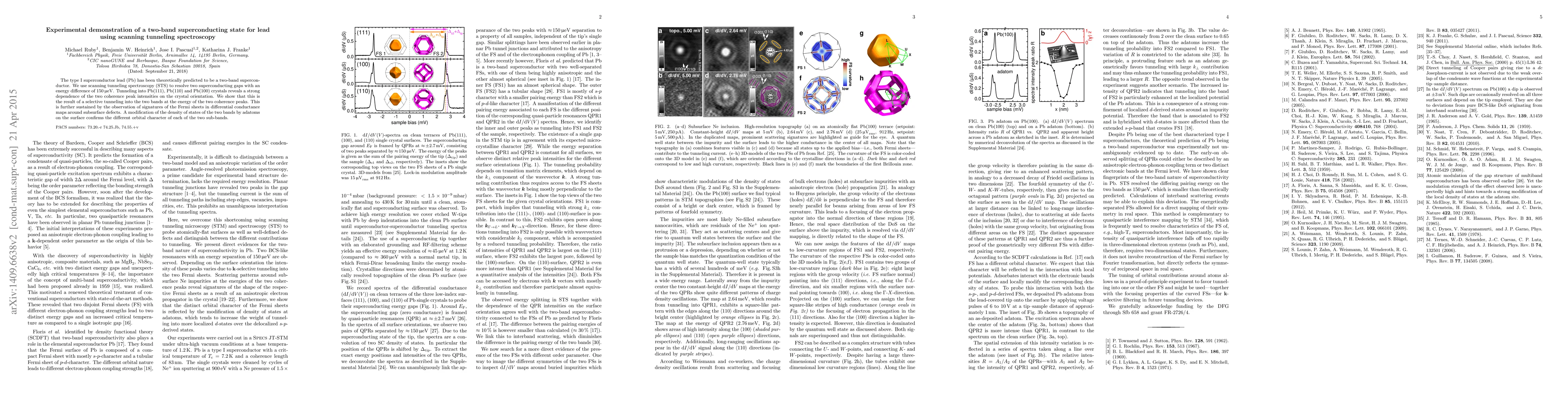 This research experimentally confirms lead as a two-band superconductor using scanning tunneling spectroscopy (STS). The study reveals two distinct superconducting gaps, with an energy difference of 150μeV, and shows that tunneling intensity varies with crystal orientation, attributed to selective tunneling into the two bands at their respective coherence peak energies. Further evidence includes observation of Fermi sheet signatures around subsurface defects and modification of density of states by adatoms, indicating different orbital characters for the two sub-bands.