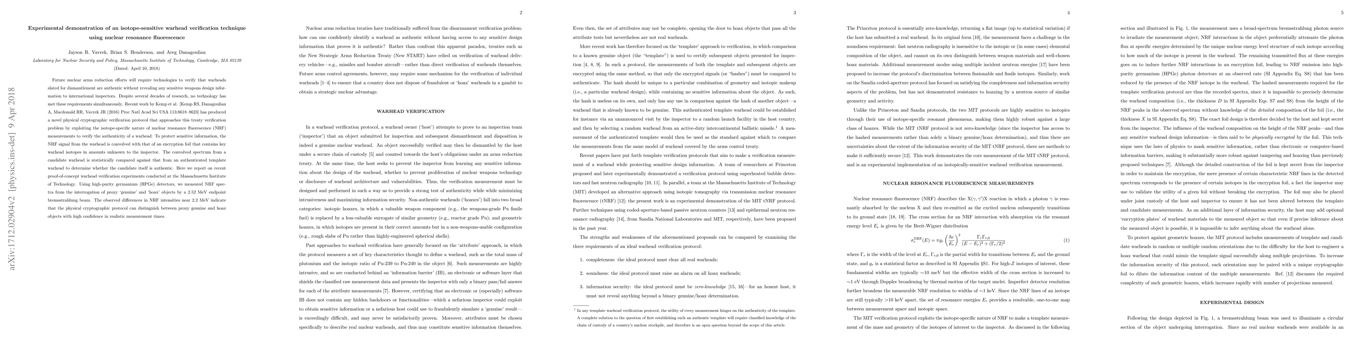 This paper demonstrates a novel isotope-sensitive warhead verification technique using nuclear resonance fluorescence (NRF). Experiments conducted at MIT show that the physical cryptographic protocol can distinguish between genuine and hoax objects using NRF spectra, offering a promising method for verifying warheads without revealing sensitive design details.