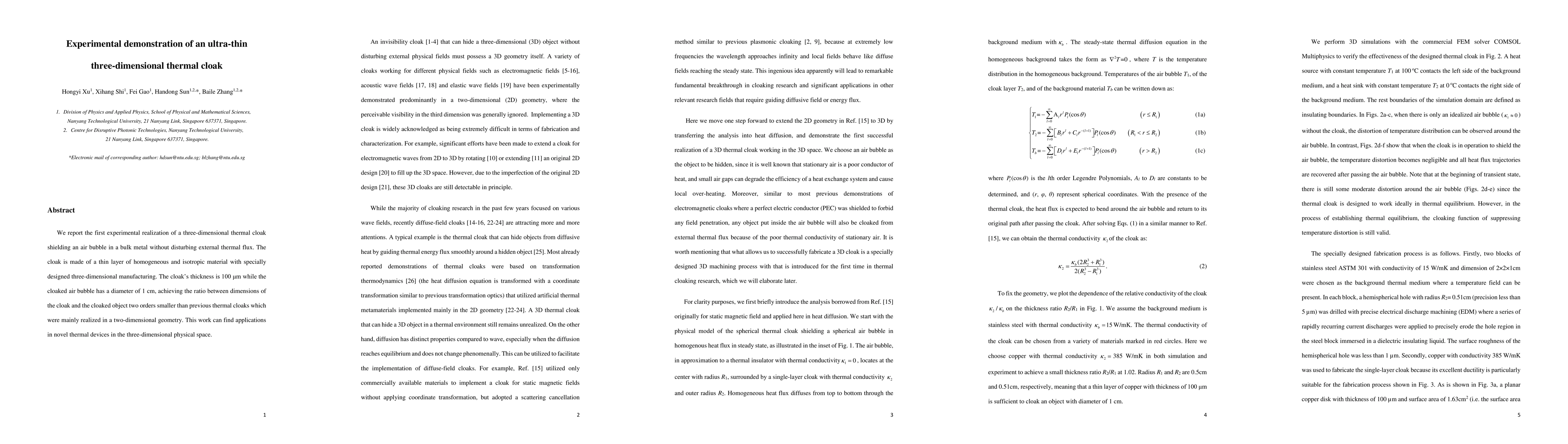 This study experimentally demonstrates a highly compact three-dimensional thermal cloak that effectively hides a 1 cm air bubble in a metal medium without affecting external thermal flux. The cloak, only 100 um thick, represents a significant advancement over previous 2D thermal cloaks, paving the way for innovative thermal devices.