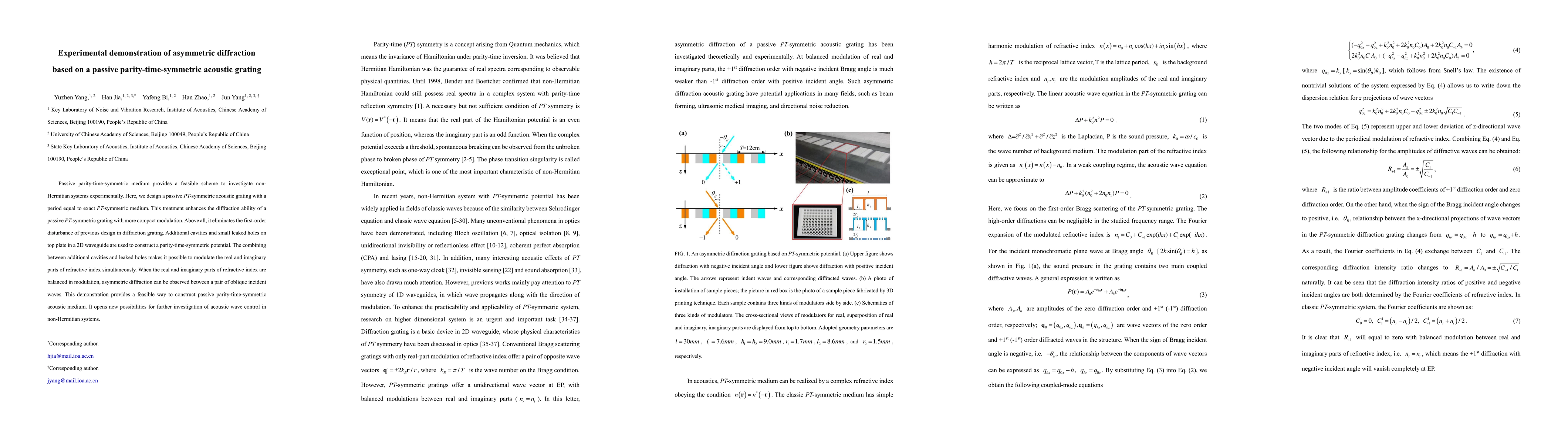 Passive parity-time-symmetric medium provides a feasible scheme to investigate non-Hermitian systems experimentally. Here, we design a passive PT-symmetric acoustic grating with a period equal to exact PT-symmetric medium. This treatment enhances the diffraction ability of a passive PT-symmetric grating with more compact modulation. Above all, it eliminates the first-order disturbance of previous design in diffraction grating. Additional cavities and small leaked holes on top plate in a 2D waveguide are used to construct a parity-time-symmetric potential. The combining between additional cavities and leaked holes makes it possible to modulate the real and imaginary parts of refractive index simultaneously. When the real and imaginary parts of refractive index are balanced in modulation, asymmetric diffraction can be observed between a pair of oblique incident waves. This demonstration provides a feasible way to construct passive parity-time-symmetric acoustic medium. It opens new possibilities for further investigation of acoustic wave control in non-Hermitian systems.