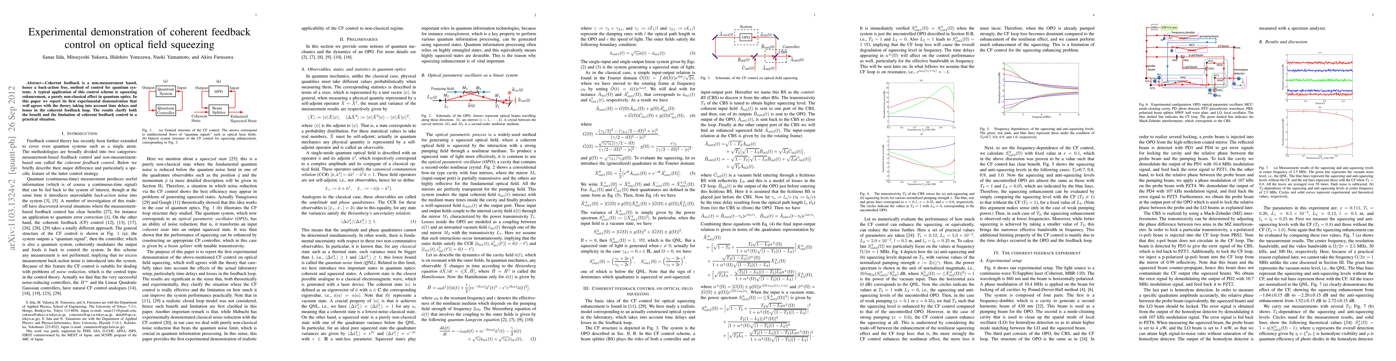 This paper demonstrates the first experimental application of coherent feedback control to enhance optical field squeezing, confirming theoretical predictions despite practical challenges like time delays and losses. The results highlight both the advantages and limitations of this non-measurement based control method in quantum optics.