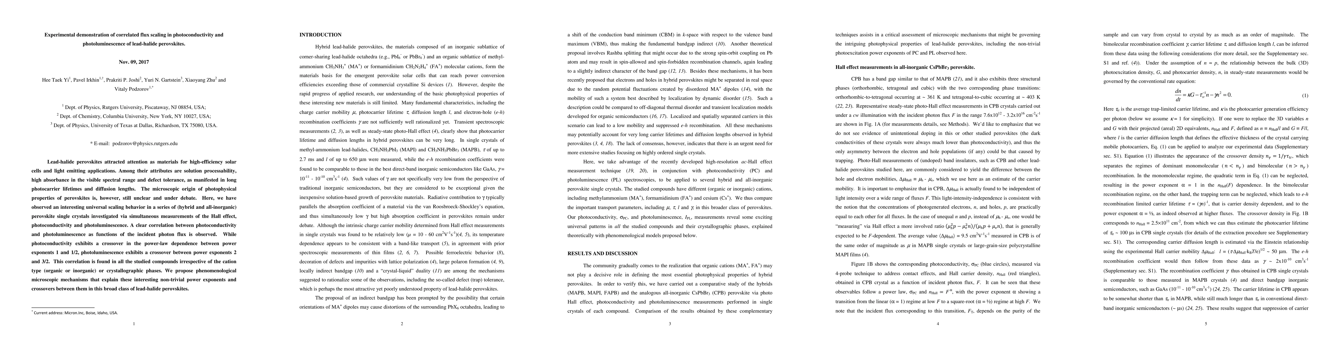 This paper demonstrates a universal scaling behavior in lead-halide perovskites, showing a correlation between photoconductivity and photoluminescence under varying photon flux. The study reveals distinct power-law crossovers in both properties across different perovskite compounds, proposing underlying microscopic mechanisms to explain these observations.