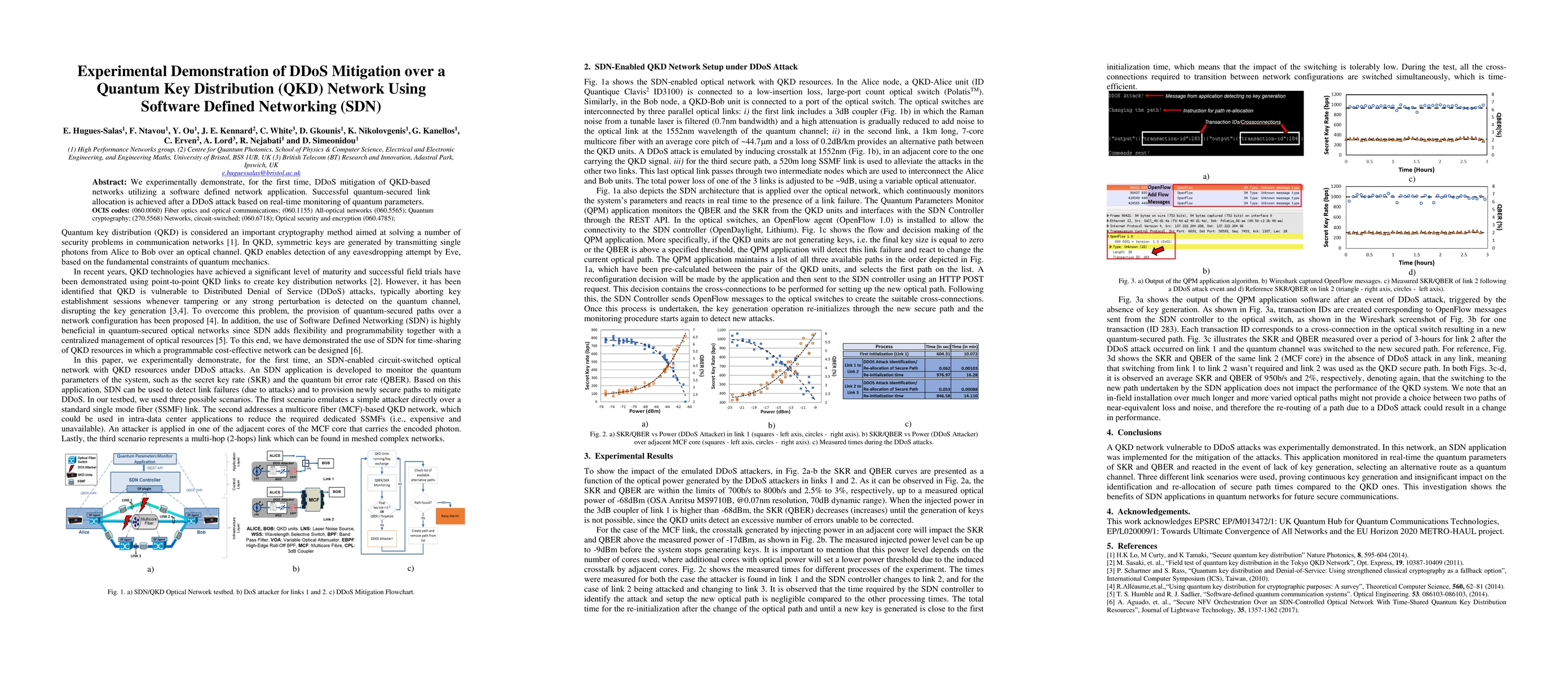 We experimentally demonstrate, for the first time, DDoS mitigation of QKD-based networks utilizing a software defined network application. Successful quantum-secured link allocation is achieved after a DDoS attack based on real-time monitoring of quantum parameters