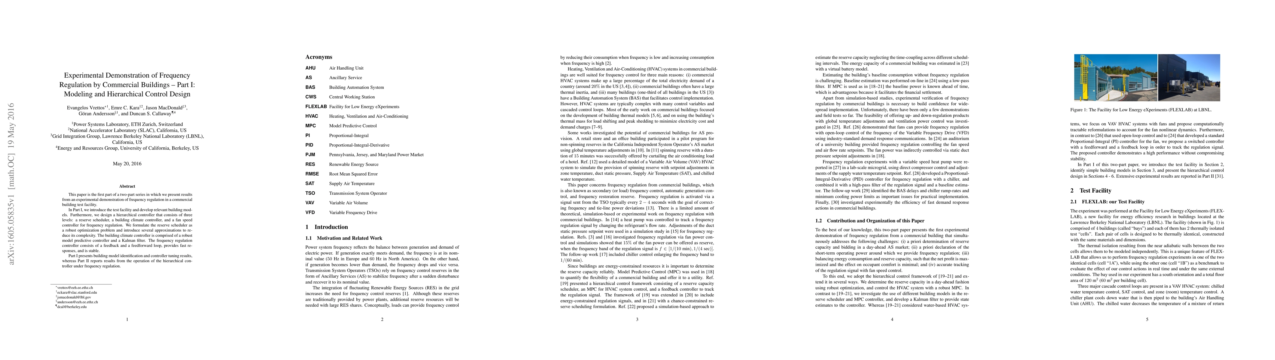 Researchers designed a hierarchical control system to regulate frequency in commercial buildings, using models and controllers to manage energy consumption and climate. The system was tested and found to provide stable responses for fast frequency regulation.