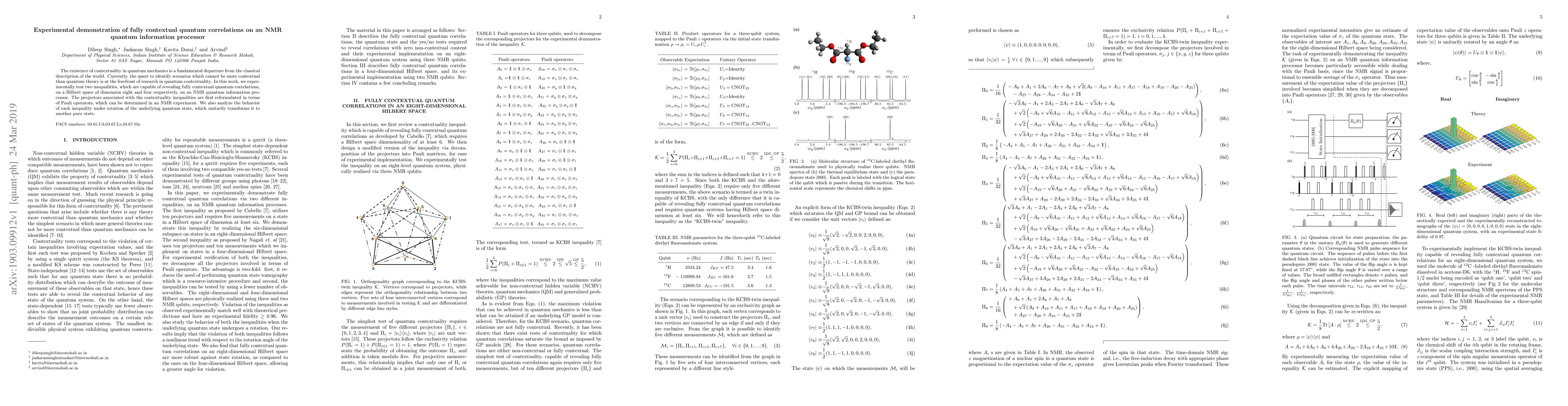 This paper experimentally demonstrates fully contextual quantum correlations using an NMR quantum information processor, testing two inequalities on Hilbert spaces of dimensions 8 and 4. The study reformulates contextuality inequalities in terms of Pauli operators for NMR implementation and examines their behavior under quantum state rotations.