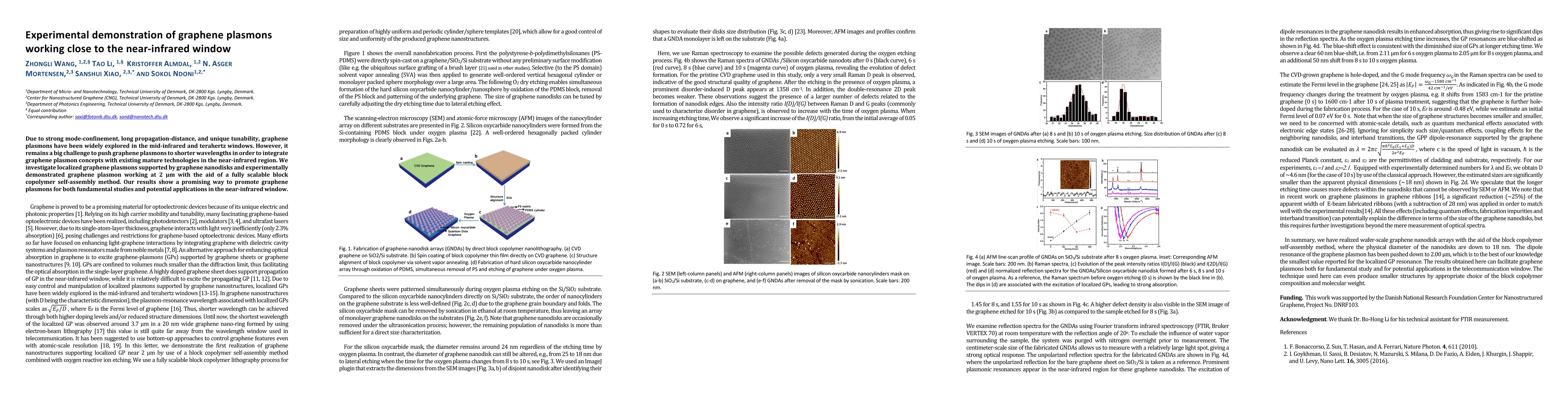 This work extends the exploration of graphene plasmons to shorter wavelengths, overcoming the challenge of integrating graphene plasmon concepts with near-infrared technologies, by utilizing a novel block copolymer self-assembly method.